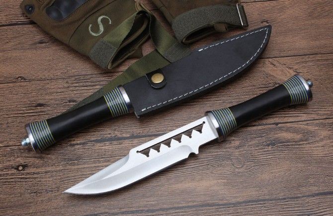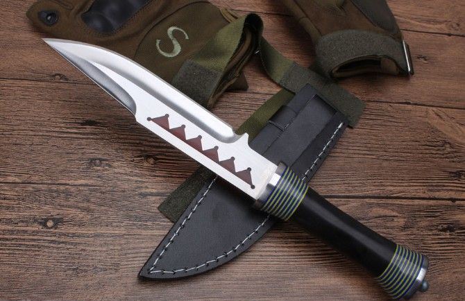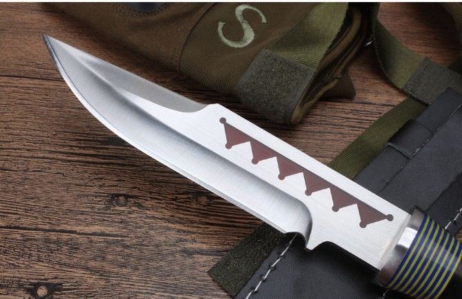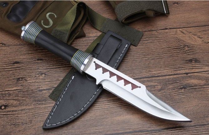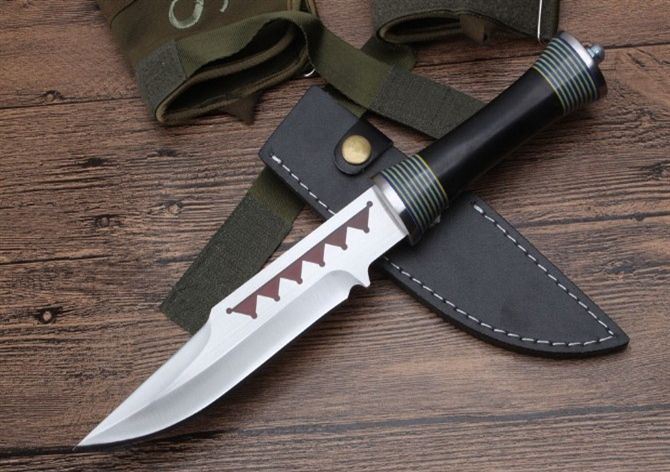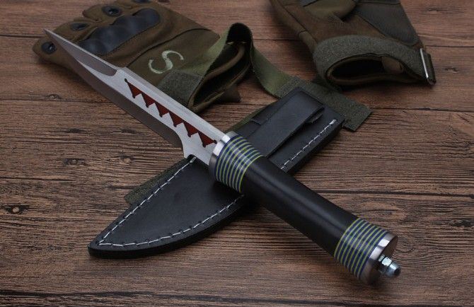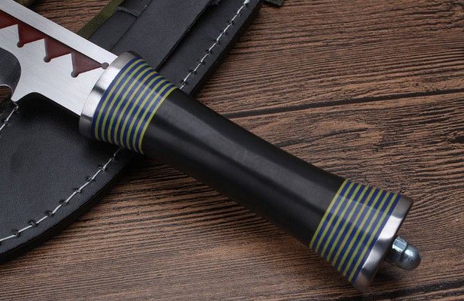 猛犸惊魂直刀 全长:31.5cm 刃长:18cm 柄长:13.5cm 刃厚:5.1mm 刃宽:3.6cm(最宽处) 刃材:420 硬度:57HRC 刀重:660克(含包装) 表面:色拉丝 柄材:钢+黑木+ABC 刀鞘:牛皮套+纸盒