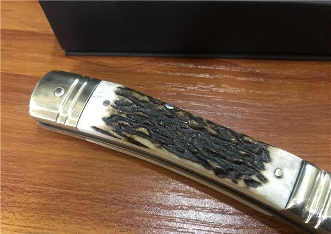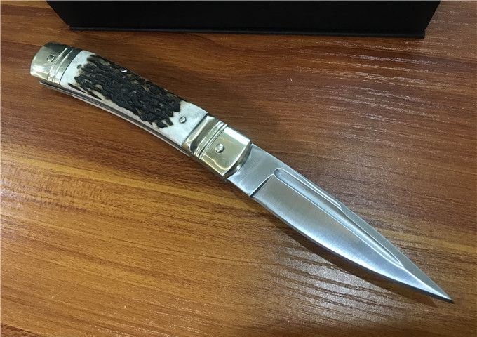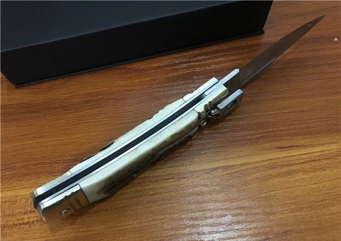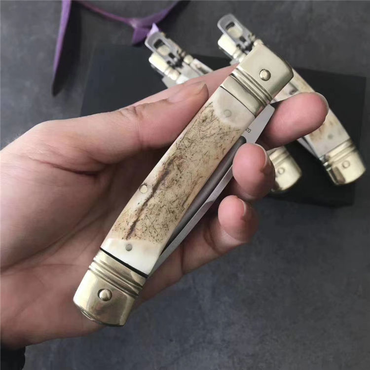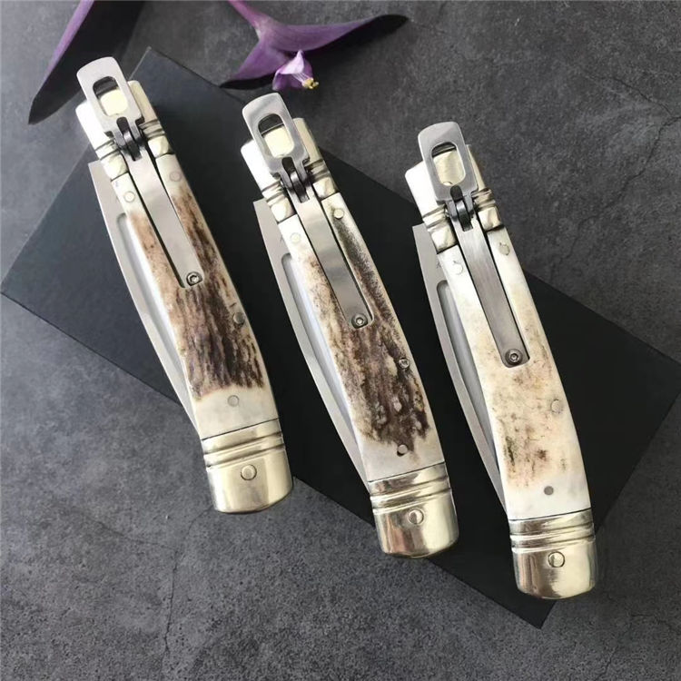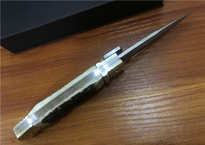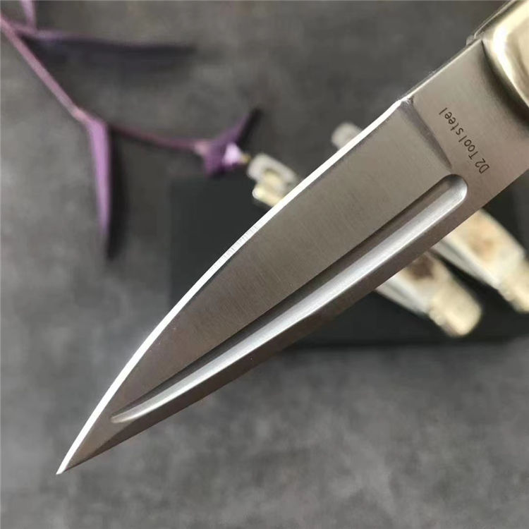 意大利AKC著名手工刀匠Bill Deshilvs设计,经典的杠杆纽扣锁定,弹簧快速打开刀刃,D2顶级高速工具钢刀刃,搭配鹿角和铜护手,非常经典,极具收藏价值,不摇头,弹卡到位,刀锋极其锋利