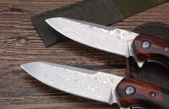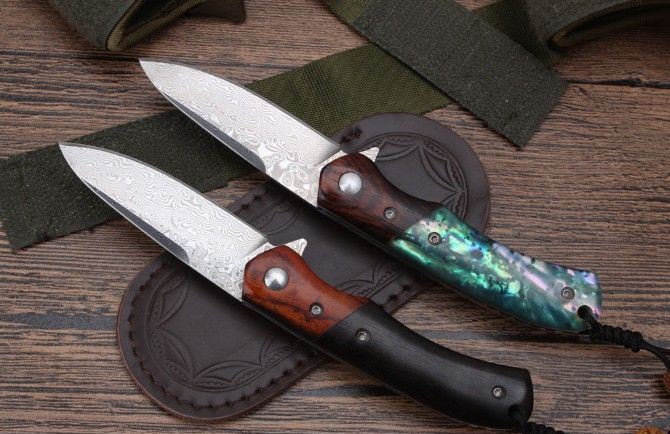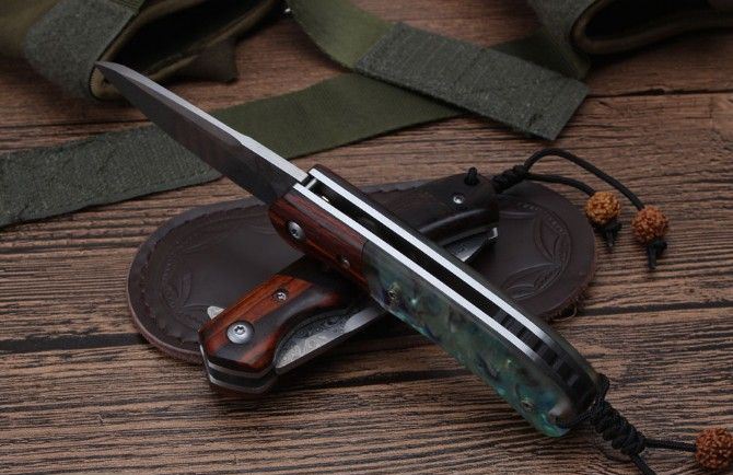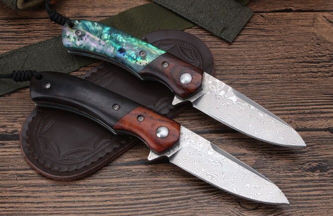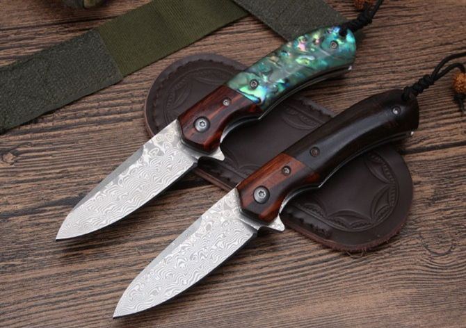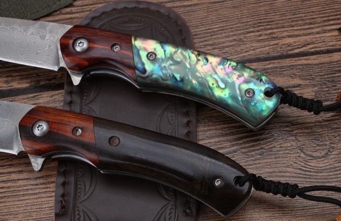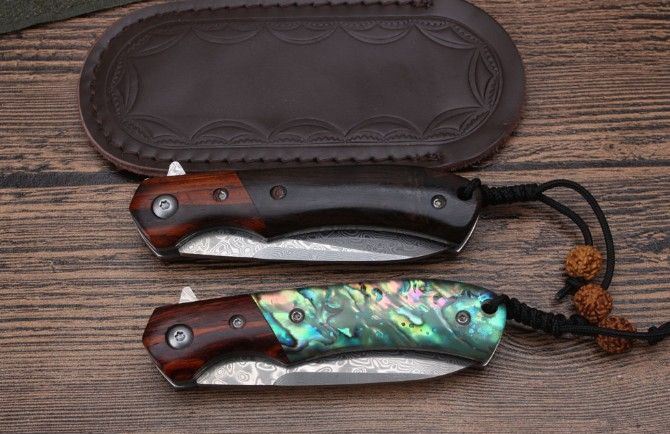 虎啸大马士革折刀 全长:16.3cm 刃长:6.8cm 柄长:9.5cm 刃宽:2.0cm 刃厚:3.8mm 刃材:大马士革钢 重量:157g(含包装) 硬度:56-57HRC 表面:大马士革原纹 柄材:花酸枝木+天然鲍贝 锁型:侧锁 其他:礼品盒+真皮套