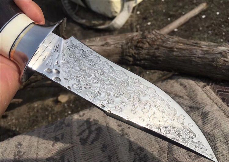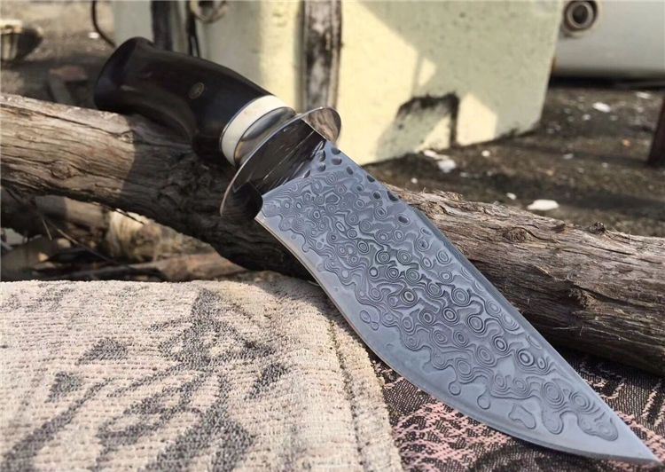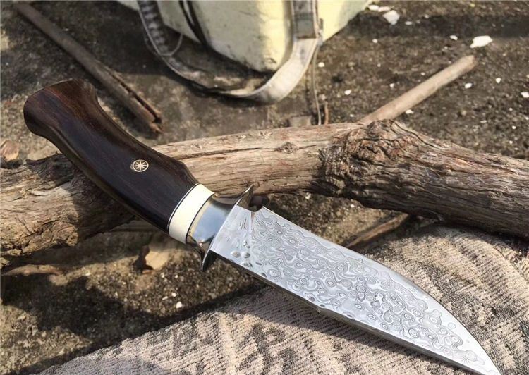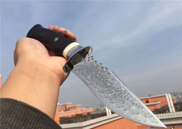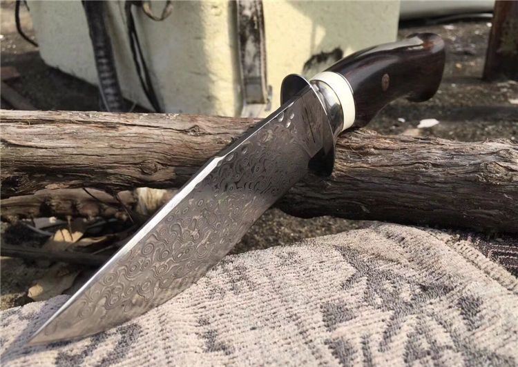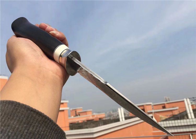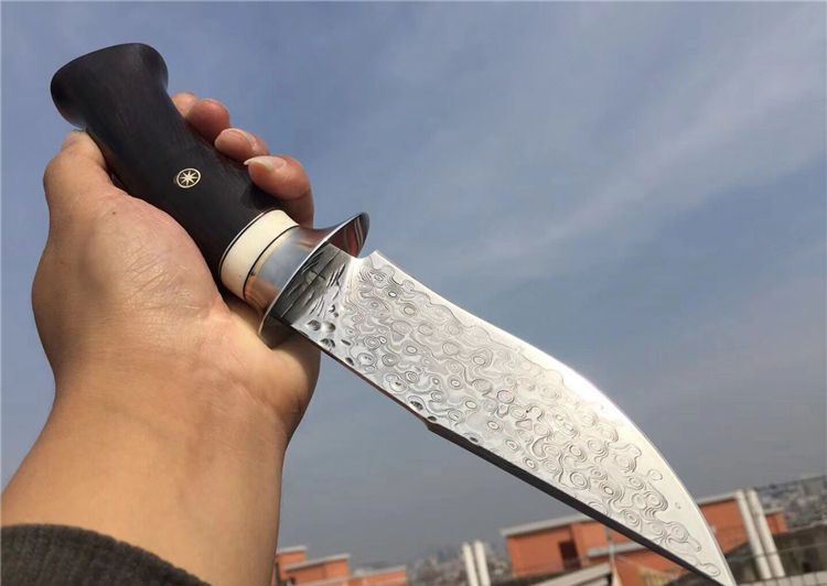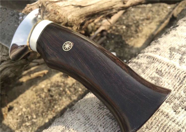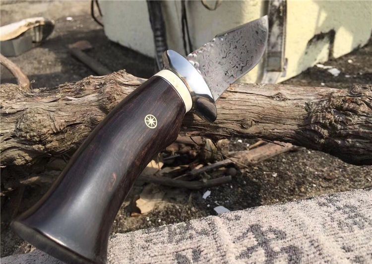 坎亚大马士革直刀 全长:25cm 刃长:12cm 手柄:12cm 刃厚:4mm 钢材:大马士革钢(VG10)真空热处理 硬度:60HRC 柄材:铜头+兽骨+进口黑檀木 刃宽:3.5cm