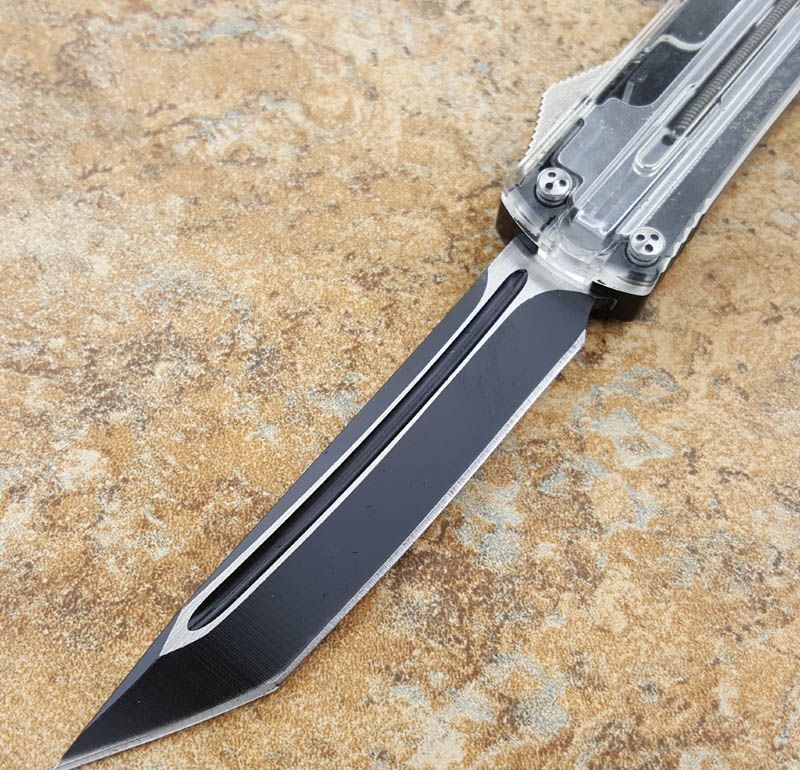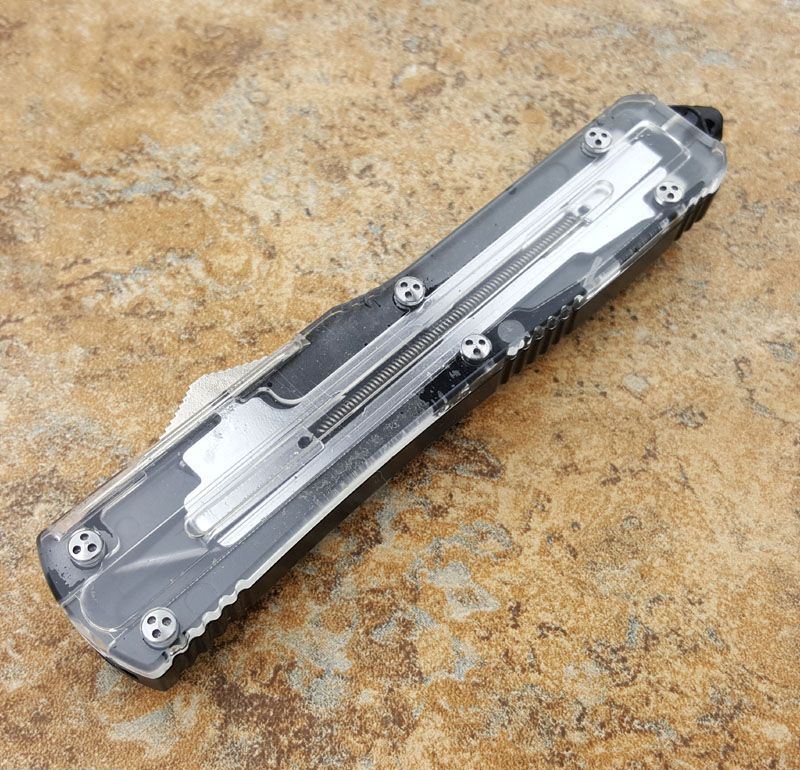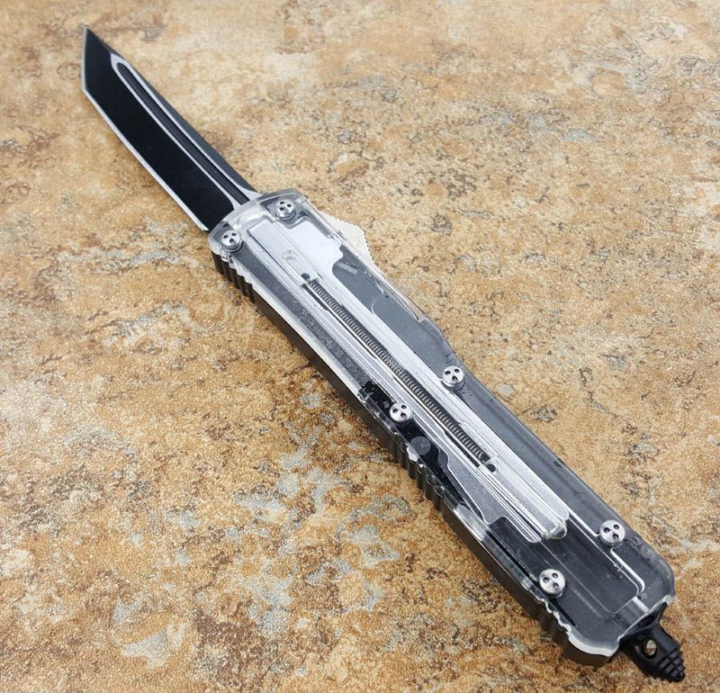 微技术ultratech 121直跳刀Tanto黑刃透视款,3.5英寸Tanto锋刃,盖子用透明树脂纤维雕刻而成,里面的弹锁机构一目了然!非常个性