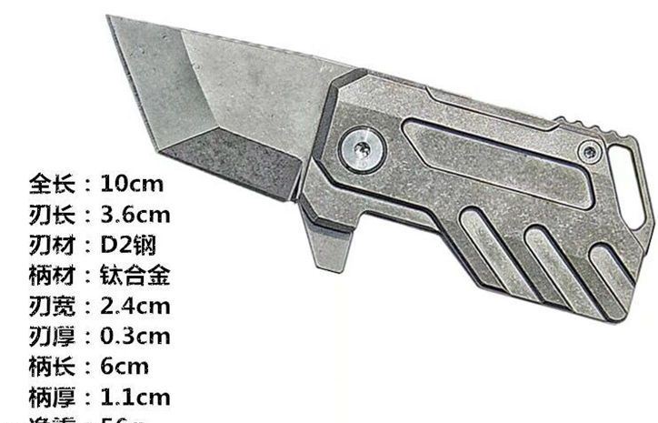 EDC钛合金小折刀 全长:10cm 刃长:3.6cm 刃材:D2钢 柄材:钛合金 刃宽:2.4cm 刃厚:0.3cm 柄长:6cm 柄厚:1.1cm 净重:56g