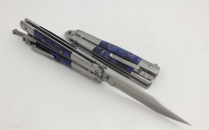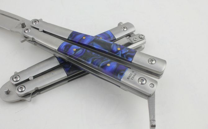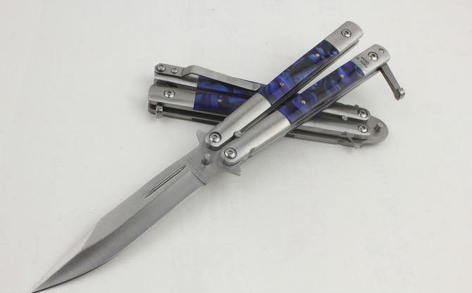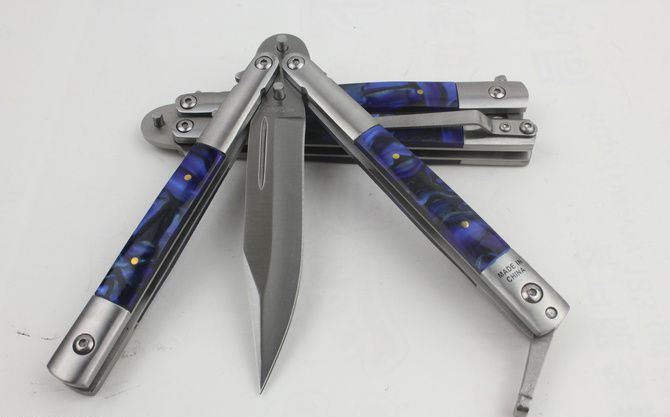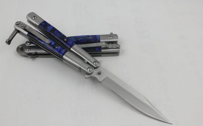 蓝色9B4L蝴蝶甩刀 全 长:22.6cm 刃 长:9.2cm 柄 长:12.2cm 刃 宽:1.8cm(最宽处) 刃 厚:2.5mm 刃 材:440 硬 度:56HRC 刀 柄:钢柄 表 面:砂光 重 量:170.0克 备 注:带背夹,尼龙套.