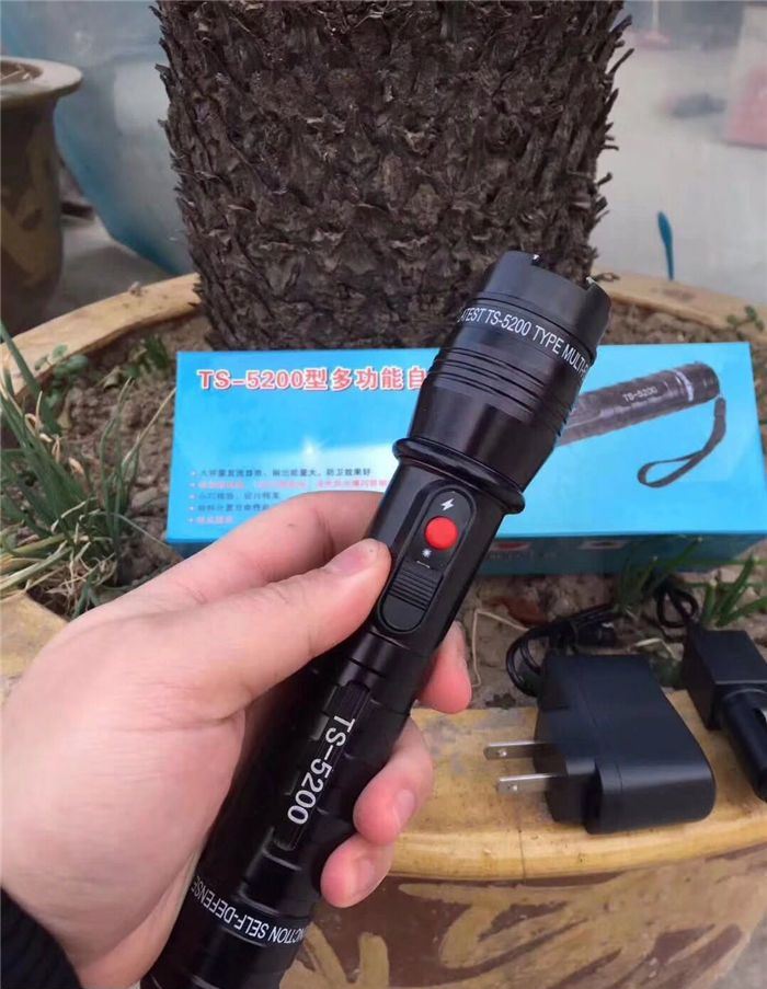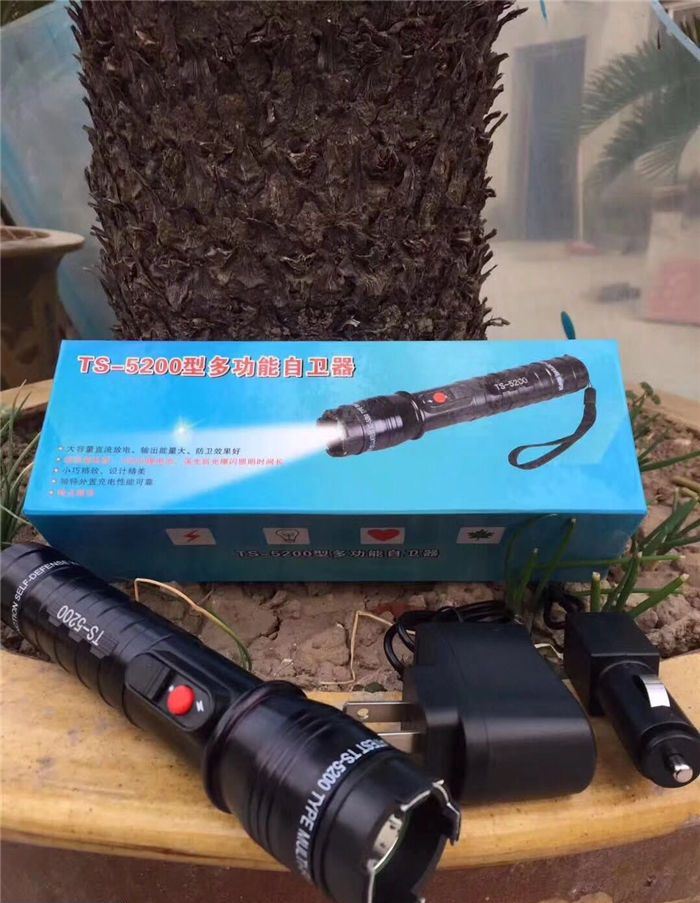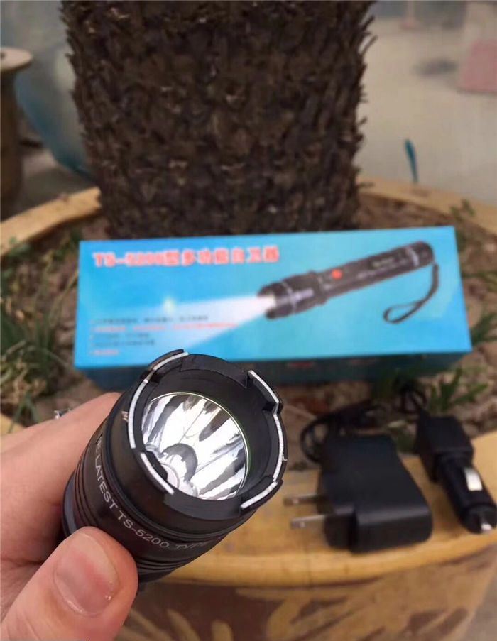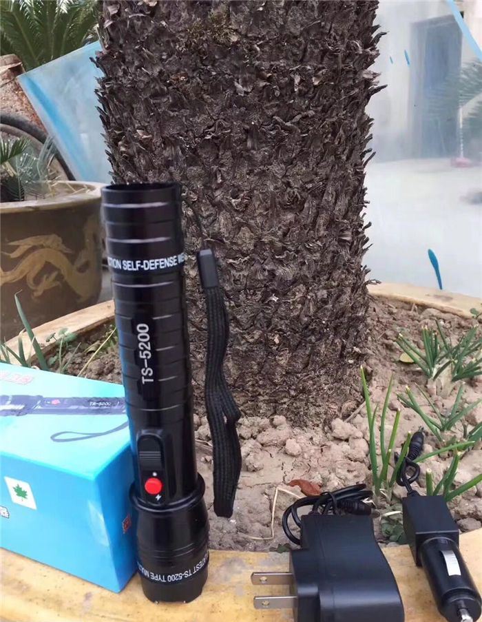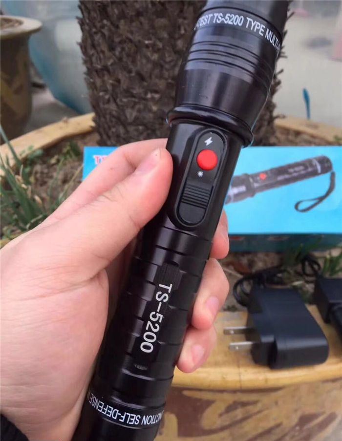 最新款5200型电棍 电压高于震天雷,镜片处附带荧光圈,户外必备,内置18650电池,附带两个充电器,家用,充电,以及车载充电,红色明显电击按钮,独特设计外形,全网首发,灯光采用T6数控灯柱,强光远射500米.