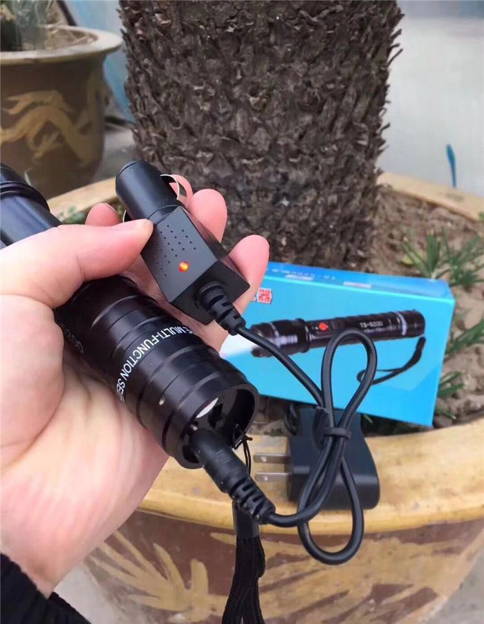 电压高于震天雷,镜片处附带荧光圈,户外必备,内置18650电池,附带两个充电器,家用,充电,以及车载充电,红色明显电击按钮,独特设计外形,全网首发,灯光采用T6数控灯柱,强光远射500米.
