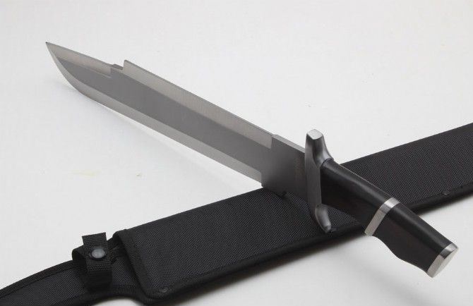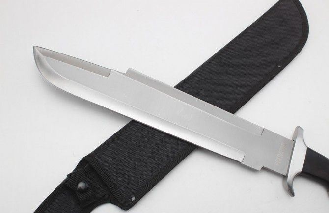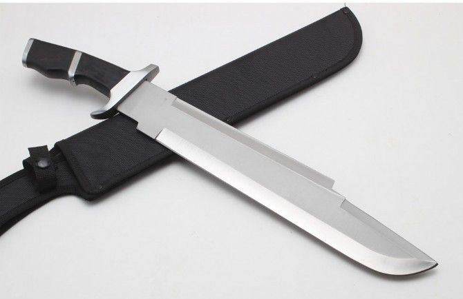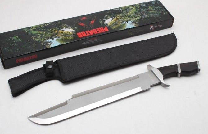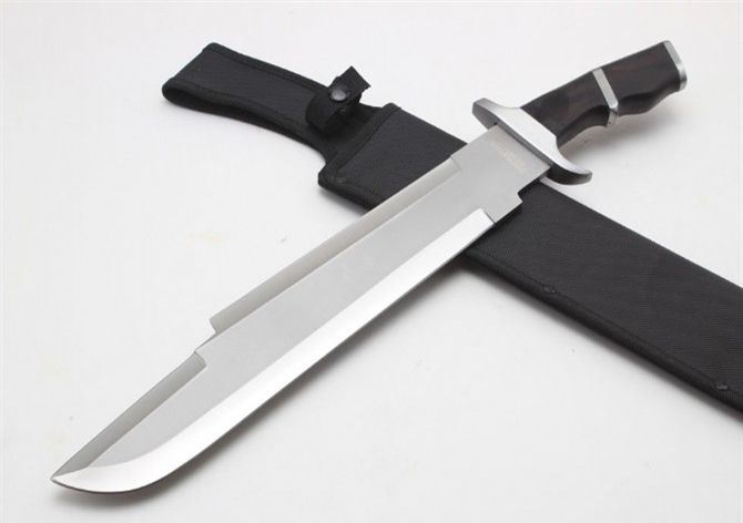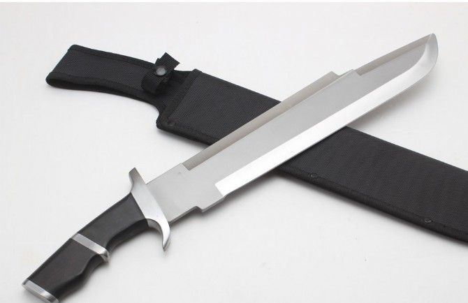 大博伊丧尸长刀 全长:51.9cm 刃长:37.5cm 刃厚:0.61cm 刃宽:6.4cm 材料:5CR13Mov 硬度:58HRC+ 柄长:15.5cm 表面:灰钛刃口沙光 柄材:护手钢头+黑檀木 重量:1370克(包含尼龙套彩盒)
