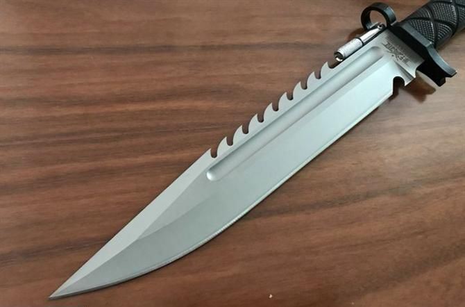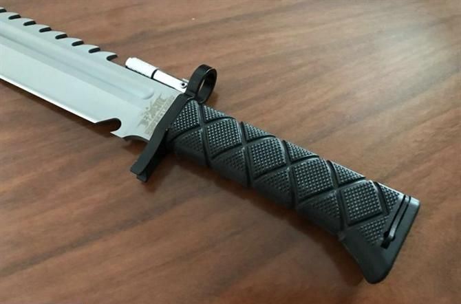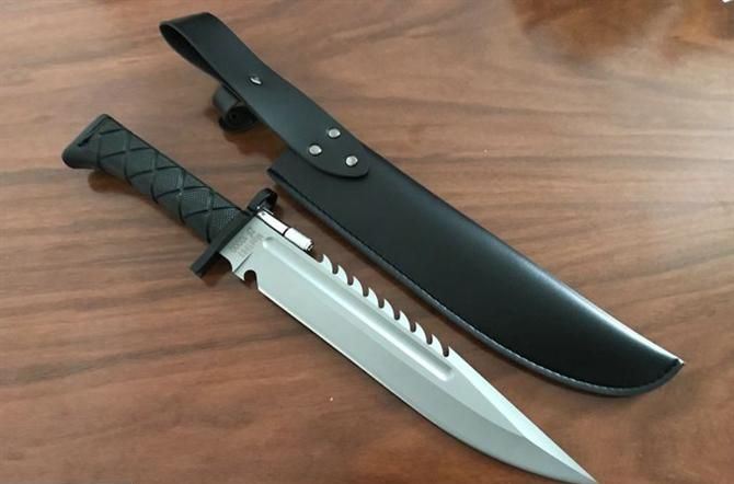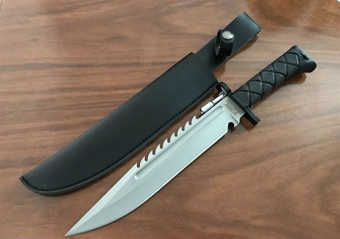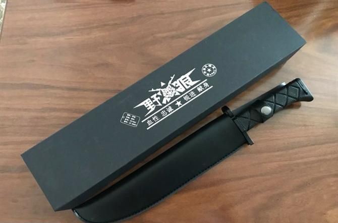 野狼哨兵刀仿皮套 全长:39.5CM 刃长:26.6CM 柄长:12.8CM 身最大宽度:4.8CM 刀厚:0.58CM 刃面:喷砂 毛重:884克 钢材:7CR15 钢硬度:57 刀柄:绝缘强化塑胶