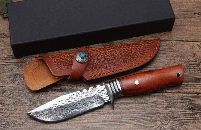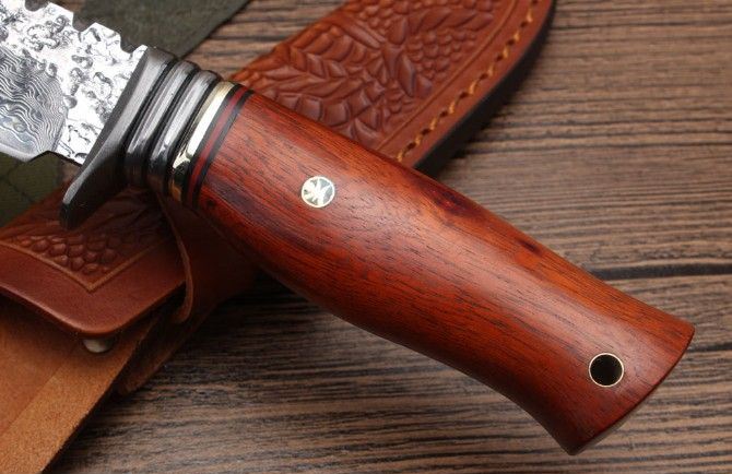 大马士革铁汉守猎刀 全长:236mm 刃长:120mm 刃宽:35mm(最宽处) 刃厚:40mm 柄长:116mm 硬度:58HRC 重量:343克含包装 表面:锻打凹凸祥云花纹原色 刃材:大马士革钢 柄材:精选进口科檀木+大马士革钢头护手 赠送:高档(纯手工雕花制作)牛皮套+精美礼品盒