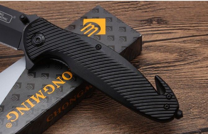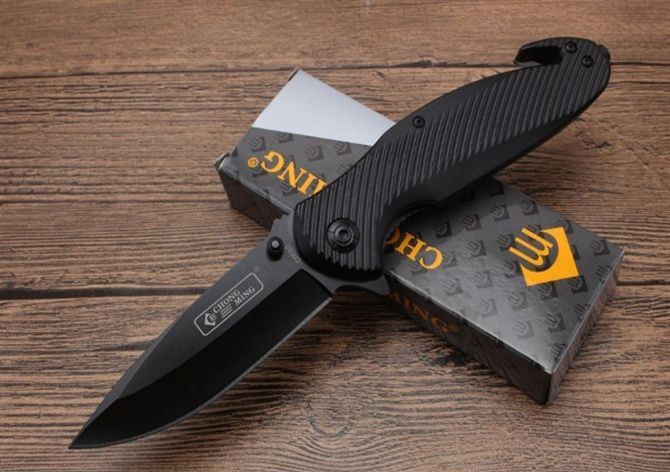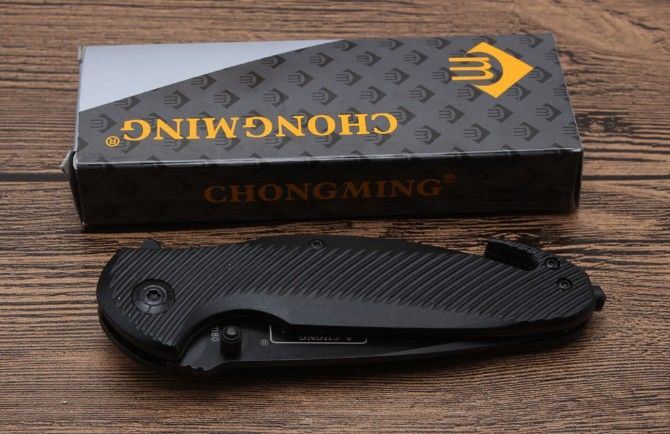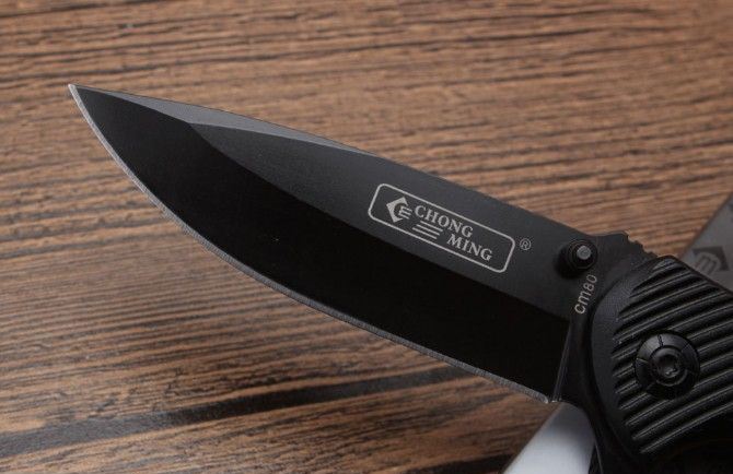 创名CM80快开折刀 全 长:21.4cm 刃 长:8.8cm 柄 长:12.5cm 刃 宽:2.7cm 刃 厚:2.5mm 刃 材; 440 重 量:162(含包装) 硬 度:57HRC 表 面:黑钛,国内外最畅销产品 柄 材:钢片+铝 锁 型:线锁 其 他:配厂盒