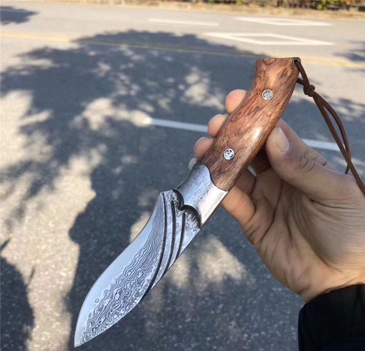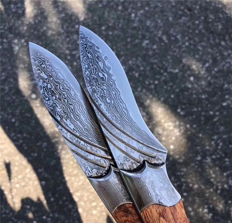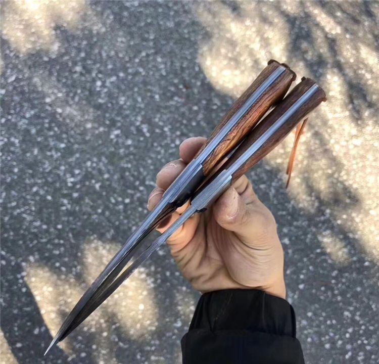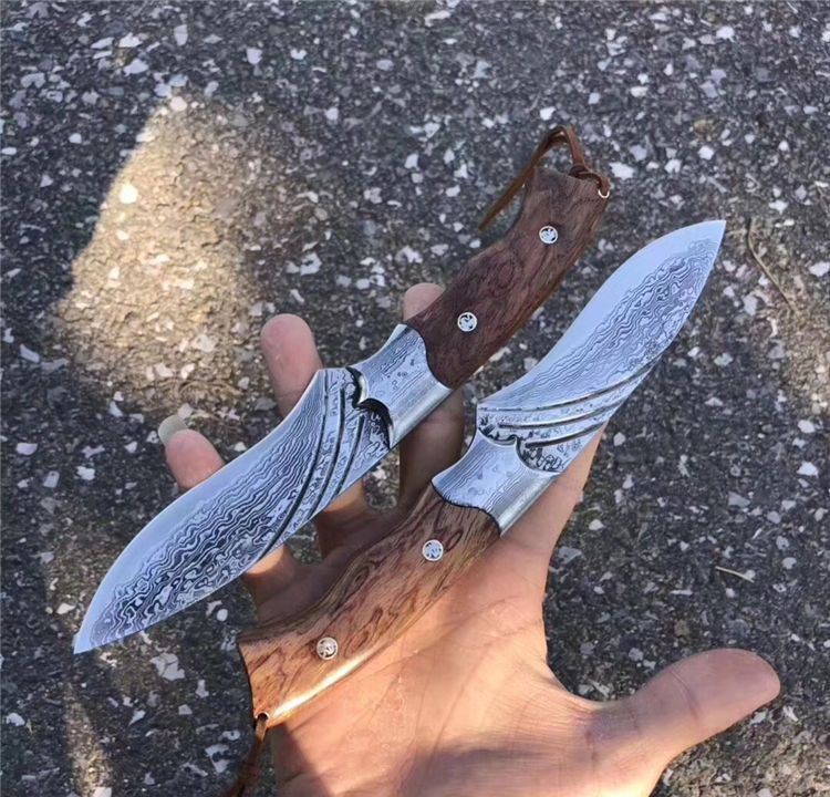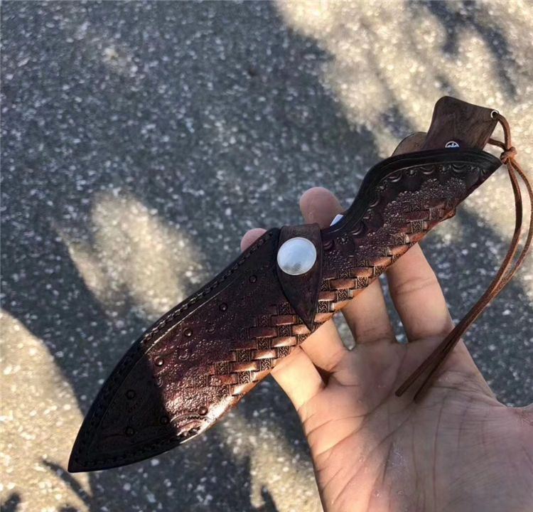 玲珑师寒兵一体大马士革猎刀 全长:22cm 刃长:10cm 刃厚度:4MM 手把长:11.5cm 刃材:大马士革一体钢(78层)风云纹理 柄材:大马士革钢头+巴花榴木 配高端手工雕花牛皮刀套,高级礼品盒装