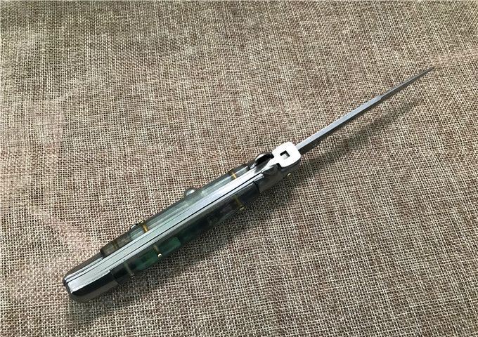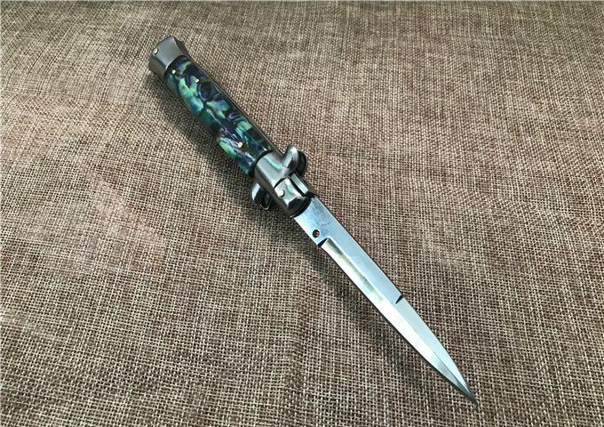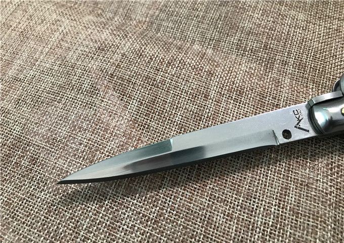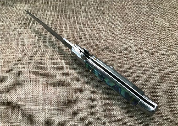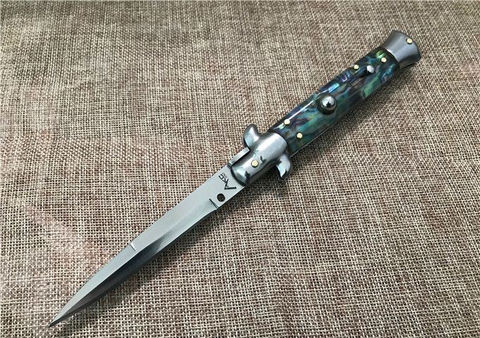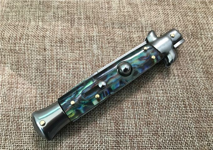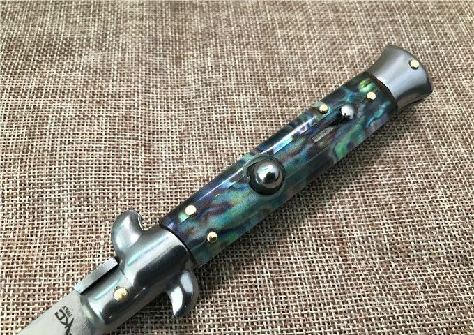 9寸AKC意大利鲍贝跳刀枪刺刃 全长:22.9mm 刃长:10.2mm 柄长:13cm 刃宽:1.2cm(最宽处) 刃厚:3.0mm 刃材:440 硬度:58HRC 刀柄:鲍贝 开刀方式:弹簧 重量:135克 包装:纸盒