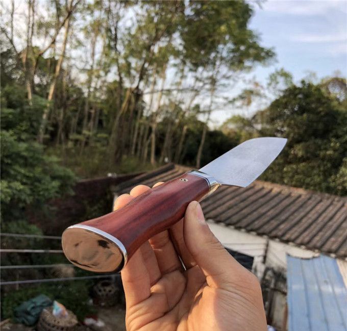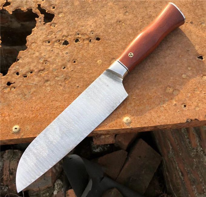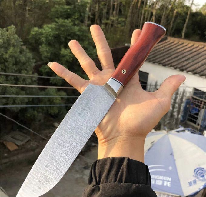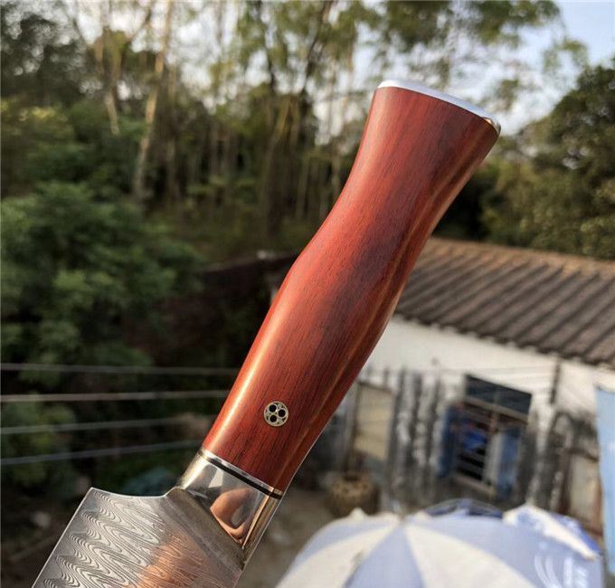 尚品8寸大马士革厨刀 全长:30cm 刃长:16.3cm 手柄长:13cm 刃钢材:大马士革钢 硬度:60HRC 刃厚度:2.2mm 手柄材料:天然科檀木+不锈钢头 包装:高级AV礼品盒 尚品8寸大马士革厨刀,刀刃采用进口VG10大马士革钢(魔音纹理),经二次开刃,才能达到如此锋利、凌空削纸、超薄切片西红柿