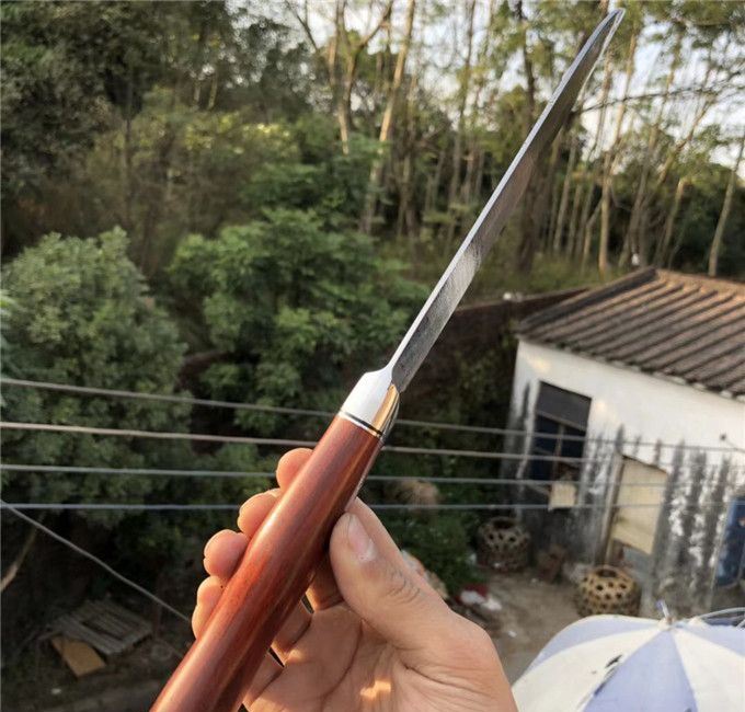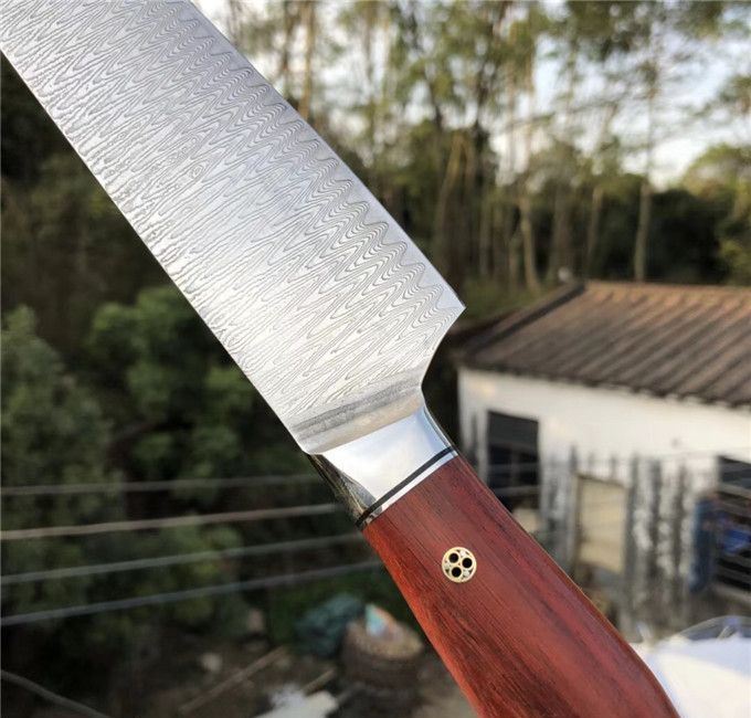 尚品8寸大马士革厨刀,刀刃采用进口VG10大马士革钢(魔音纹理),经二次开刃,才能达到如此锋利、凌空削纸、超薄切片西红柿