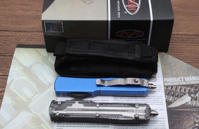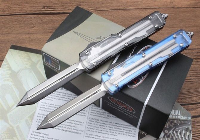 2018款微技术UT85跳刀尖头双锋 总 长:21.4CM 刀 片长度:8.4CM 刀 片厚度:4.3MM 刃 材:D2 手 材:铝 硬 度:58-59HRC 净 重:99克 包 装:彩盒刀套