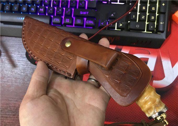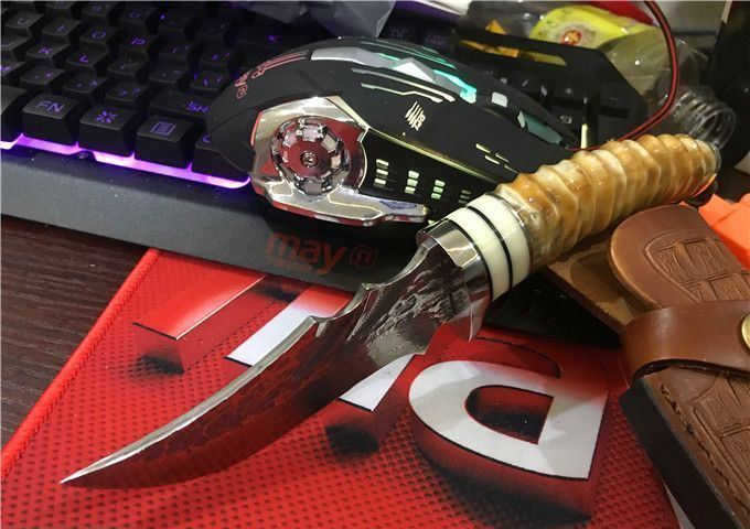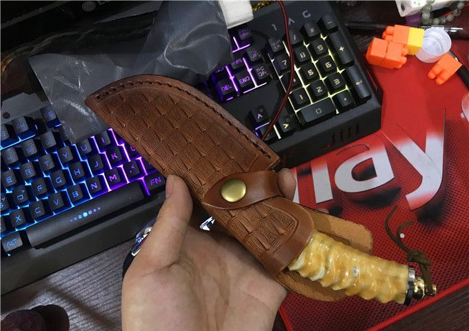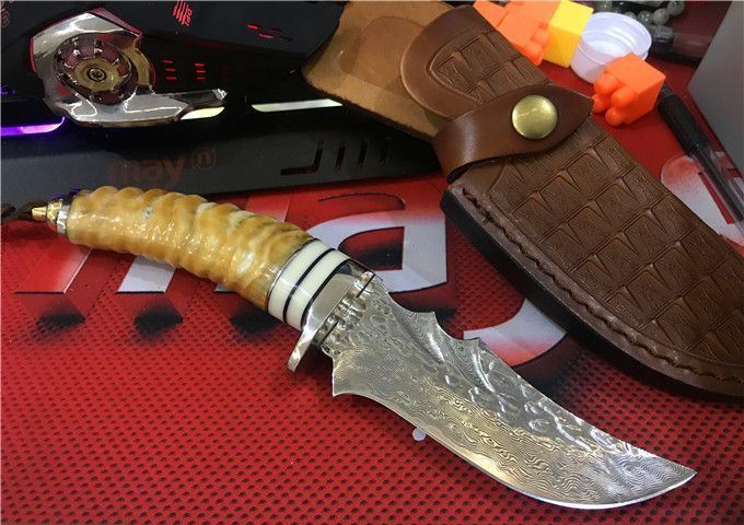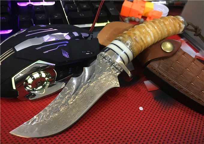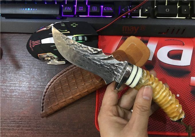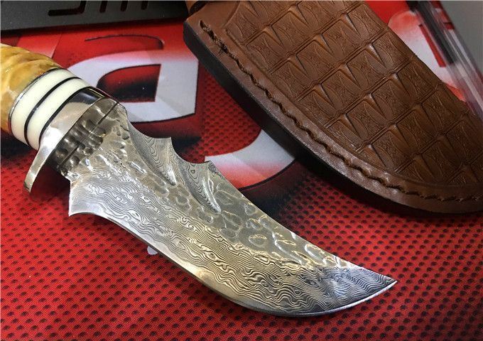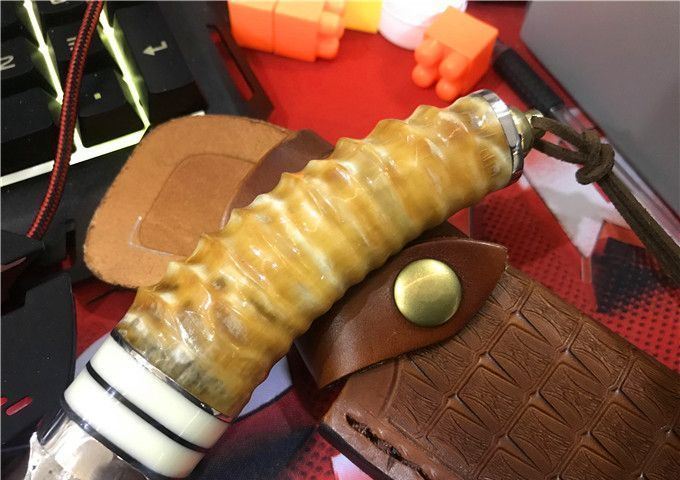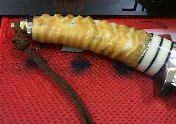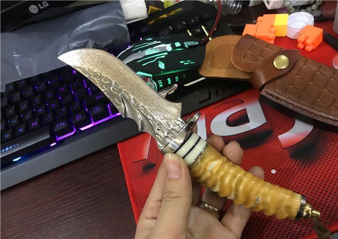 鳄鱼大马士革VG10钢小直刀 全 长: 23cm 刃 长: 11.1cm 柄 长: 10.5cm 刃 厚: 4.2mm 刃 宽: 4.3cm 刃 材:正品进口Vg10大马士革 硬 度: 59-60HRC 重 量: 约400克(含包装) 表 面: 锻打祥云花纹原色 柄 材:天然羊角+不锈钢+仿骨+G10 配 送:高级礼品盒+原装高档皮套 彩用进口大马士革钢作刀刃,锻打祥云花纹朵朵饱满,精选天然黄羊角镶牛角作手柄,经打磨抛光后棱角自然手感一流