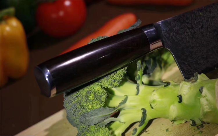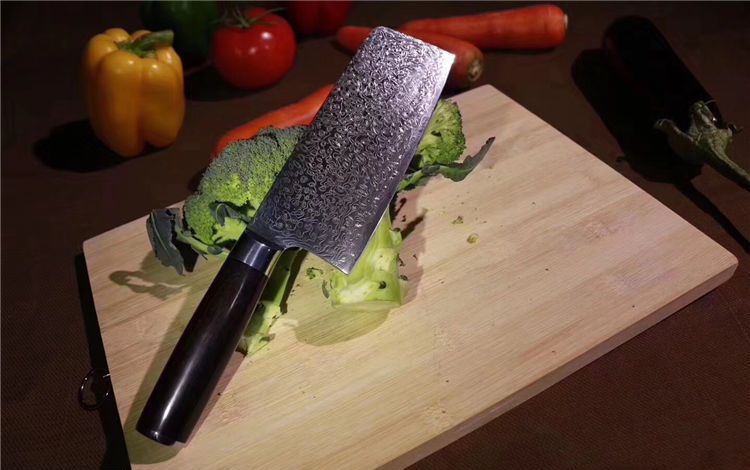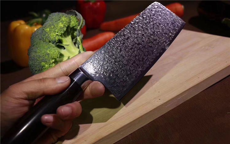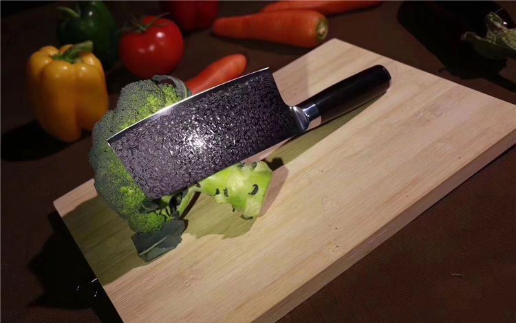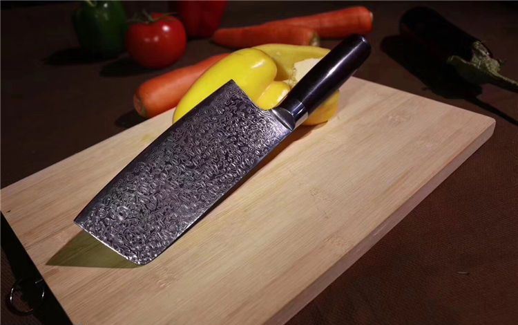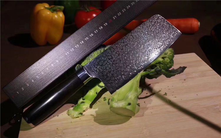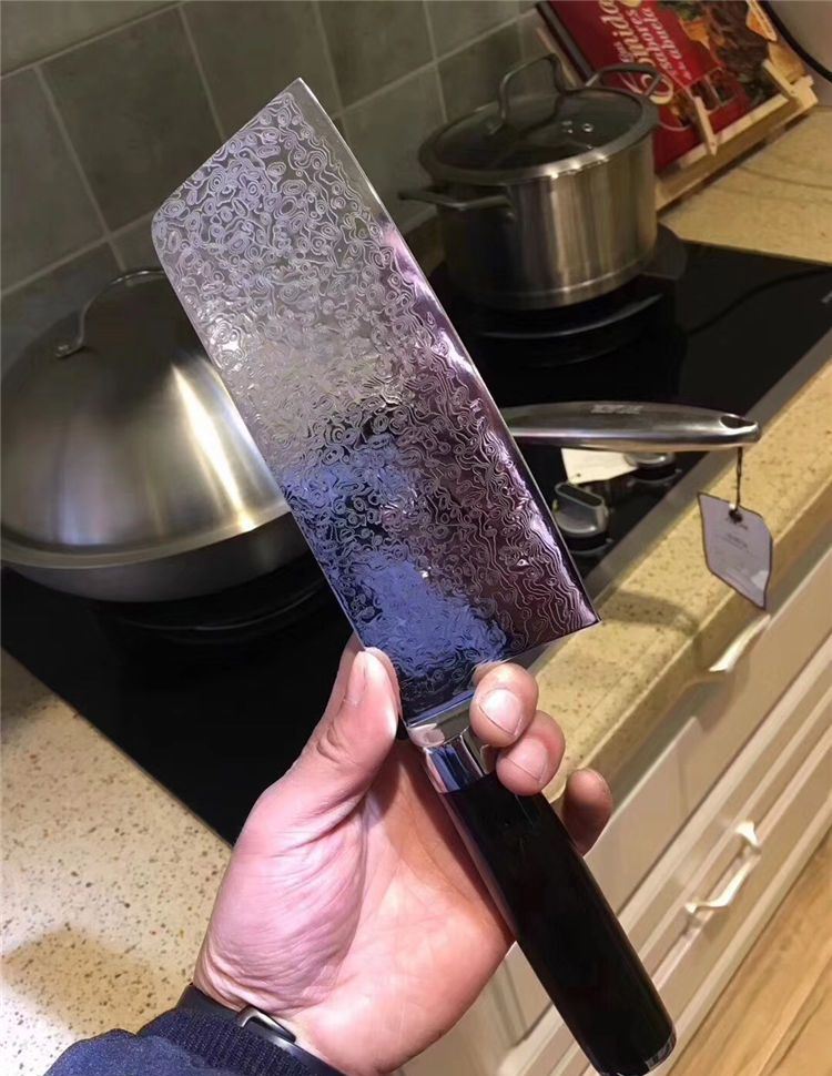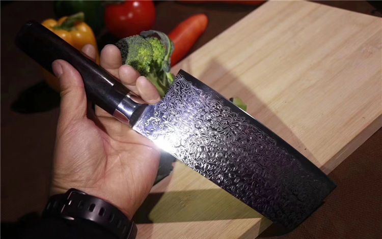中式大马士革御品刀 总长:29.5cm 刃长:16.5cm 刃宽:6.5cm 钢材:日本夹层大马士革钢33层(钢芯层VG10) 硬度:62 柄材:进口黑檀木+不锈钢头纯手工打磨手感极佳 16度手工开刃,更加锋利
