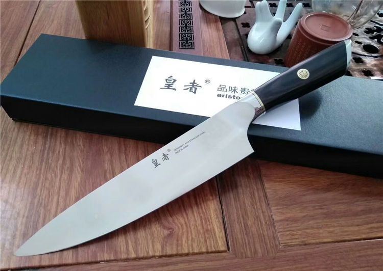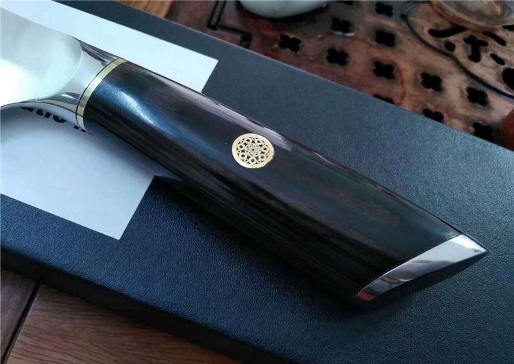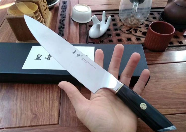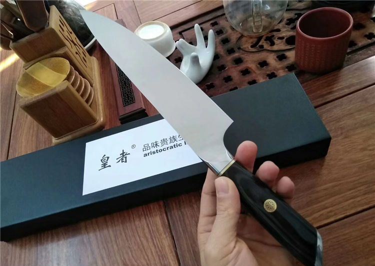 皇者战国雄风高品质厨刀 全 长:330mm 刃 长:200mm 刃 厚:2mm 刃 材:德国进口1.4116钢材 柄 材:不绣钢头+彩木+梅花铜柳钉 硬 度:58-60HRC 其 他:配礼品盒