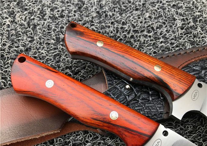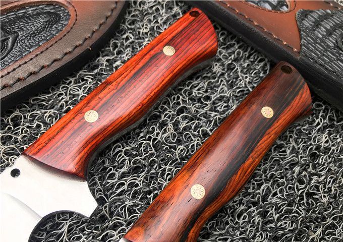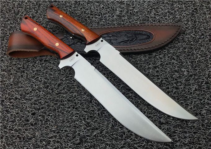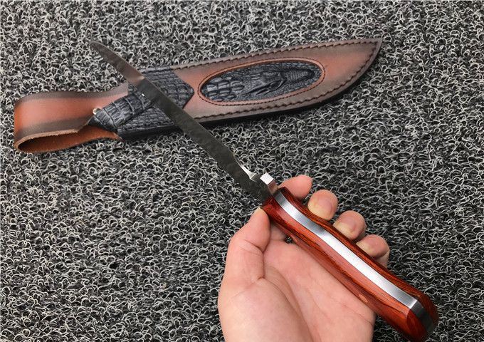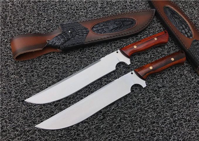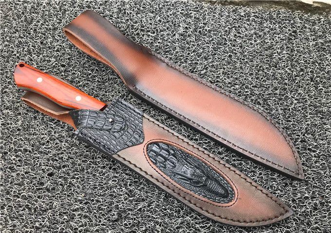 外贸版战鳄军刀 全长:349MM 刃长:195MM 刃厚:5MM 刃宽:38MM 刀刃:9CR18MOV 硬度:59-60HRC(真空油冷热处理) 表面:精幼砂光 刃面打磨:大平磨 柄材:微粒黄檀 配件:手工刀纯铜马赛克铆钉 刀鞘:手工雕花皮鞘(采用可手工进口高档皮料) 刀重:约500G