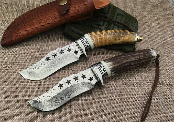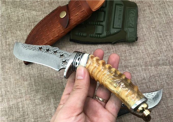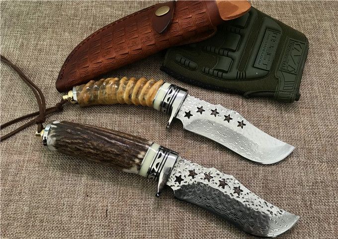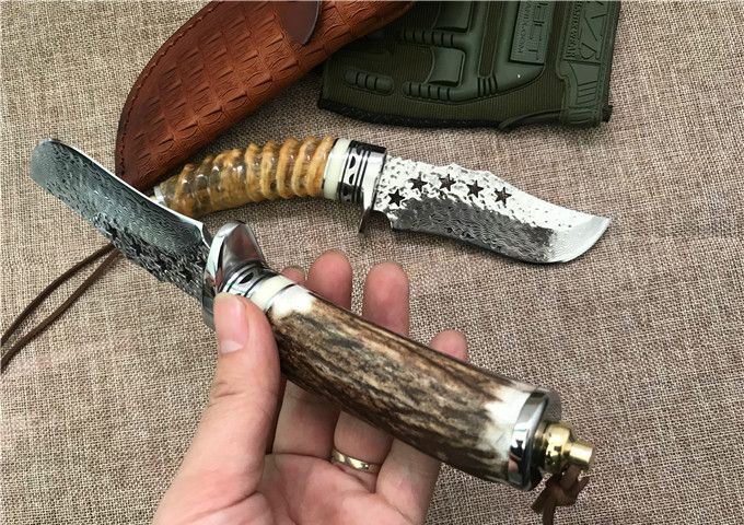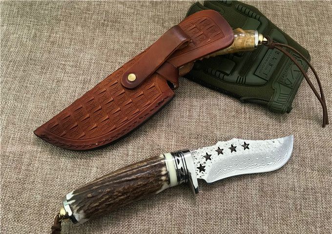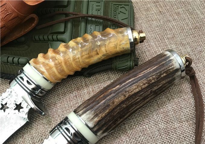 五星大马士革小直刀 全 长: 23cm 刃 长: 11.1cm 柄 长: 10.5cm 刃 厚: 4.2mm 刃 宽: 4.3cm 刃 材:正品进口Vg10大马士革 硬 度: 59-60HRC 重 量: 约400克(含包装) 表 面: 锻打祥云花纹原色 柄 材:天然羊角或鹿角 配 送:高级礼品盒+原装高档皮套 彩用进口大马士革钢作刀刃,锻打祥云花纹朵朵饱满,精选天然黄羊角镶牛角作手柄,经打磨抛光后棱角自然手感一流