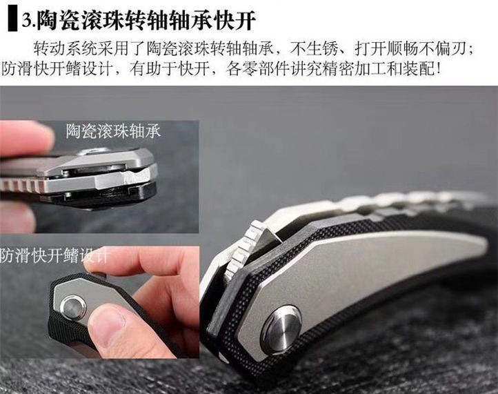 TS75尖叫折刀D2钢 总长度:200毫米 刀片长度:80毫米 手柄长度:110毫米 刀片厚度:4毫米 刀片宽度:27毫米 刀片材质:D2(房间100%,D2,可以测试) 处理材料:砂光拉丝 柄材:钛合金+黑色G10 刀片处理:缎面 手柄处理:CNC 硬度:58-60 HRC 系统:滚珠轴承系统 净重:130克(误差2克) 其他:纸箱礼品包装