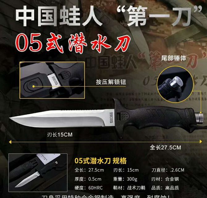 中国海军05式潜水刀 材质:合金钢 硬度: 60HRC 类型:军刀 全长:27.5厘米 刃长:15 厘米 厚度:0.5厘米 宽度:2.6厘米 产地:中国 刀身采用特种合金钢制造,高强度,耐腐蚀! 已经装备我国蛙人部队,是一款质量非常好的顶级军用制式刀具!