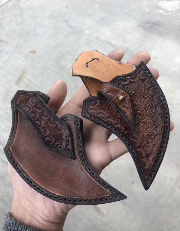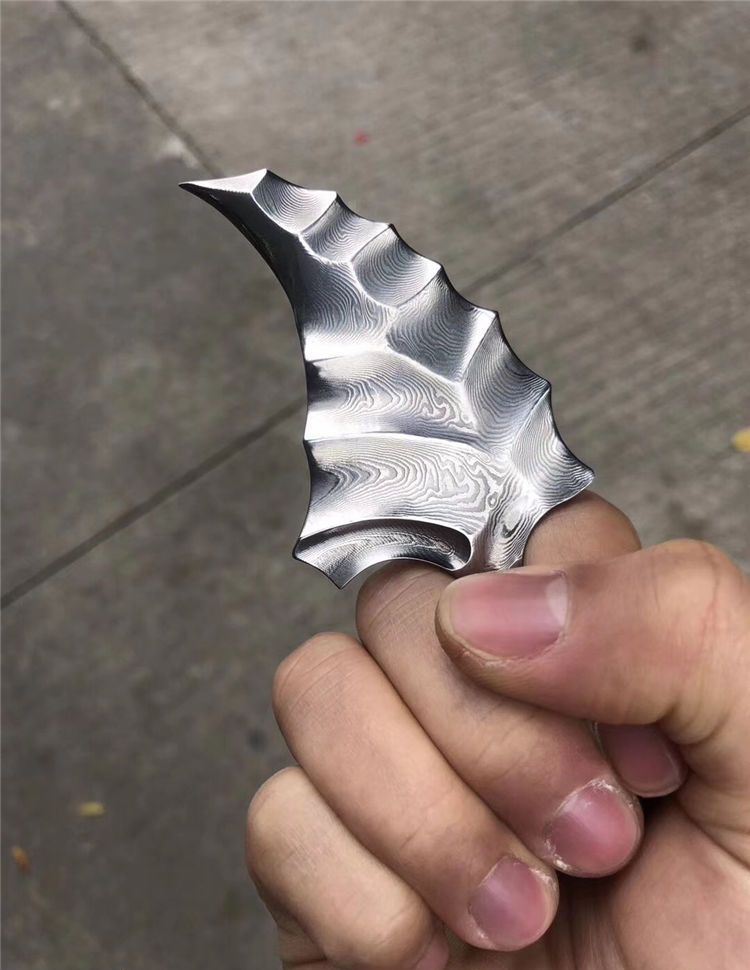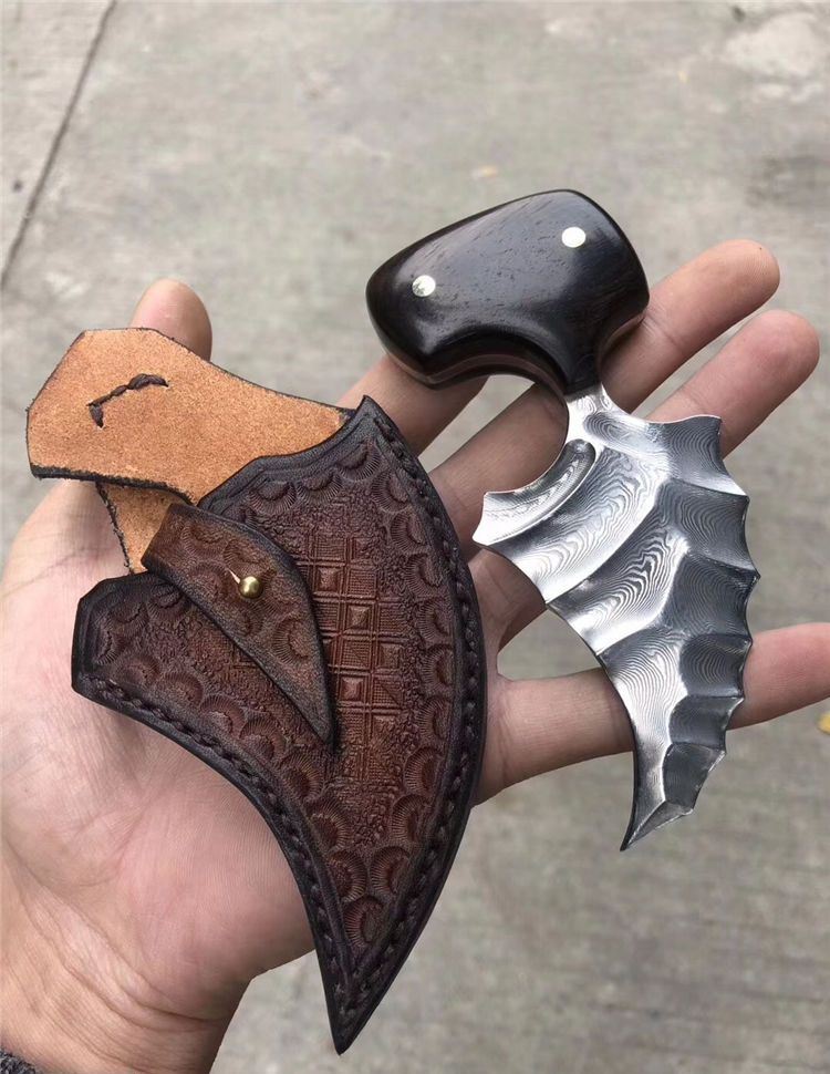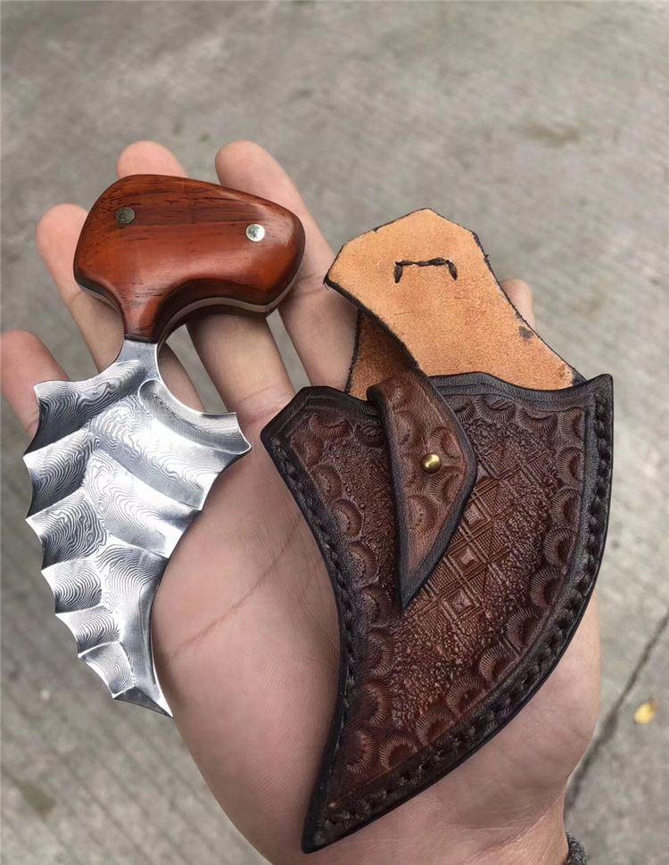 富贵叶大马士革手刺 总长:12cm,开刃地方3cm,尖头,可以刺割物体 刃宽:5cm 刃厚:4MM 钢材:日本夹层大马士革钢(VG10)钢芯 硬度:58-59HRC 热处理:真空热处理 柄材:进口微粒黄檀木/进口黑檀木 皮套:意大利进口植鞣手工雕花皮套(纯收工制作雕花缝线) 作用:日常把玩,户外求生防身,开快递包裹,收藏把玩!欣赏!