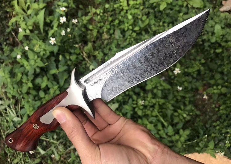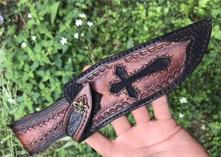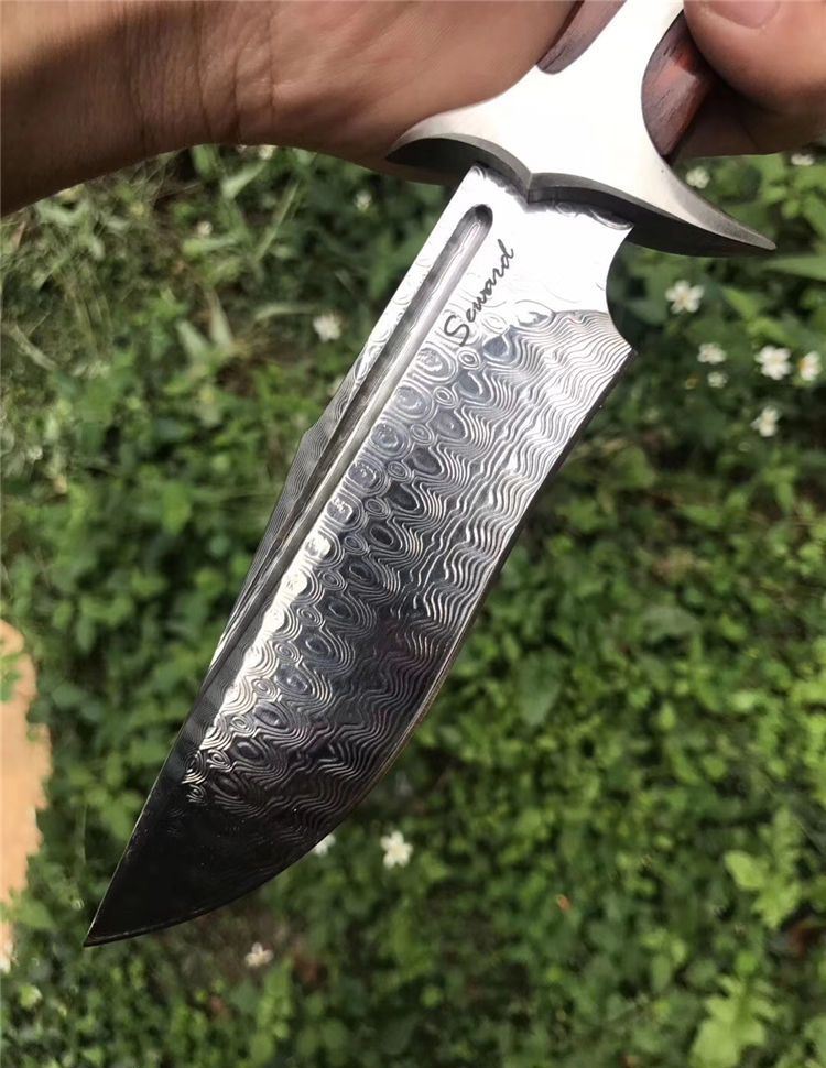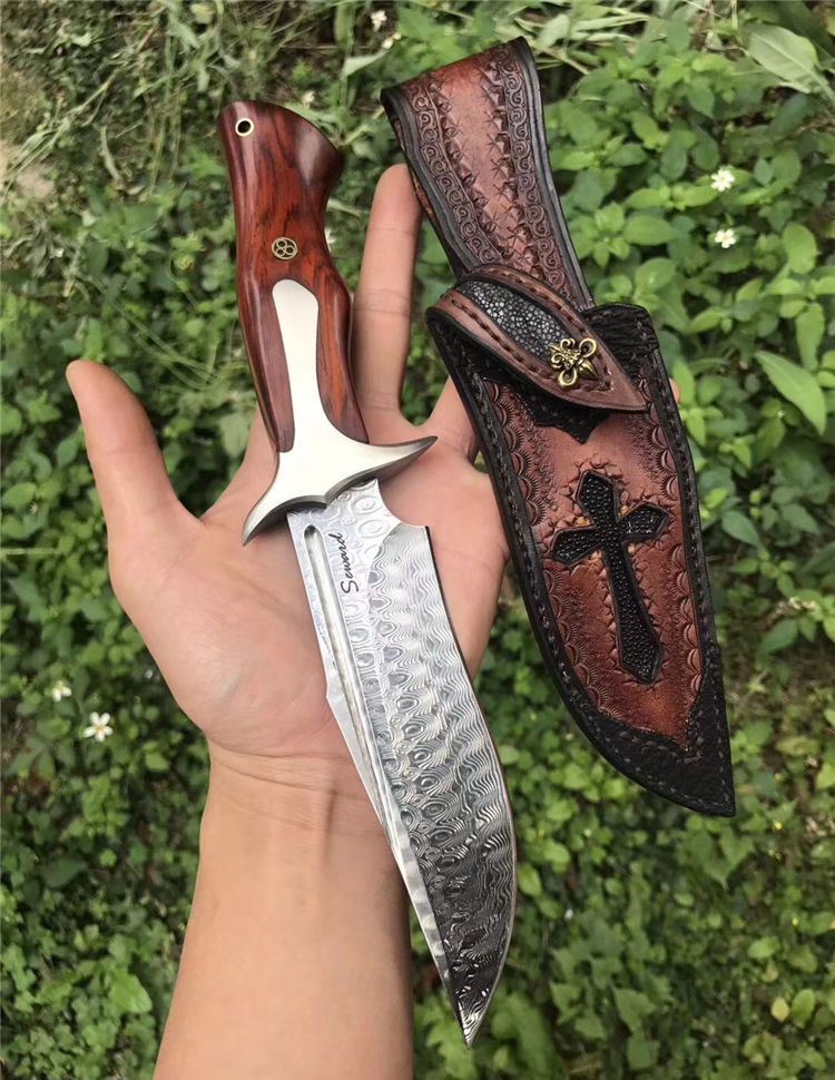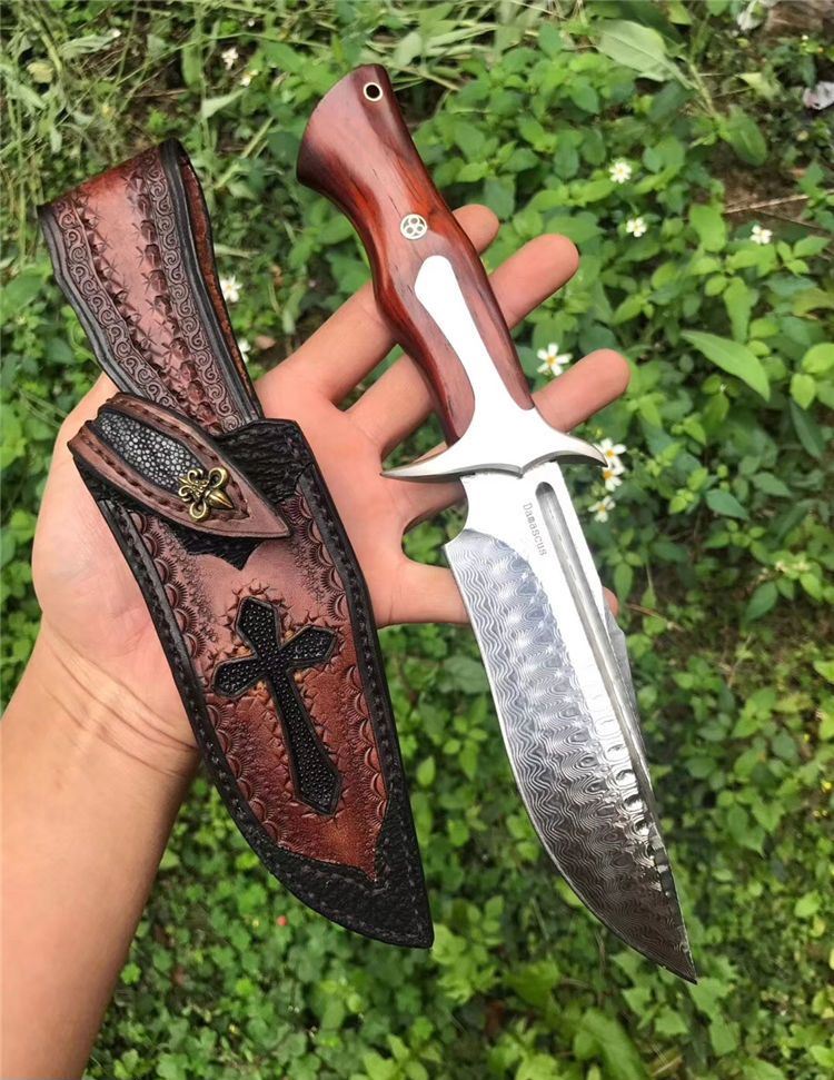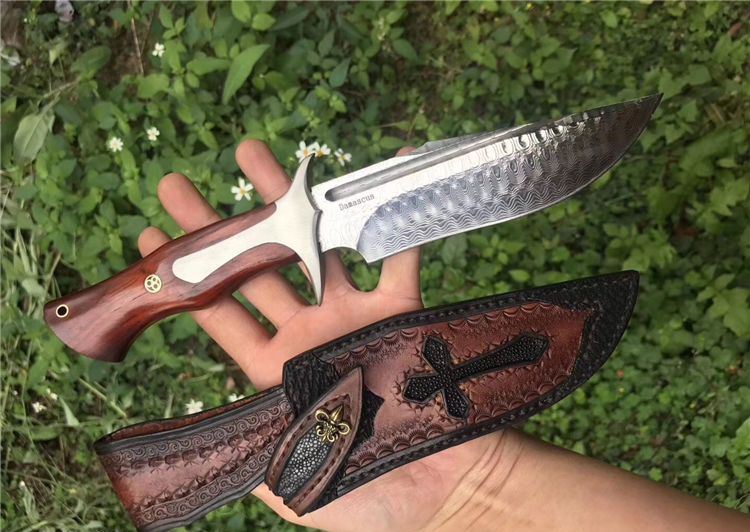 十字中型博伊大马士革直刀 刃材:进口大马士革钢,不带钢芯 柄材:进口微粒黄檀木 总长:270MM 刃长:140MM 刃厚:5MM 刃宽:40MM 硬度:60-62HRC 热处理技术:真空热处理 表面效果:电脑数控水磨,砂光效果 护手:430不锈钢电脑CNC,不吸磁铁 皮套:意大利进口手工雕花手工缝线植鞣皮镶嵌魔鬼鱼皮,复古经典怀旧效果。 开刃方式:水冷二次开刃,以锋利度为主。一刀断粗麻绳,超级锋利! 结构构成:刀刃一体龙骨贯穿入护手与木柄内,铆钉锁定柄内罐胶水定型!安全牢固不容易出现松动