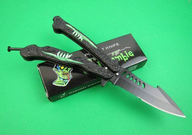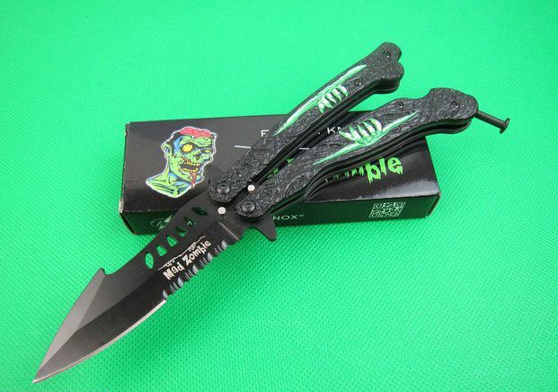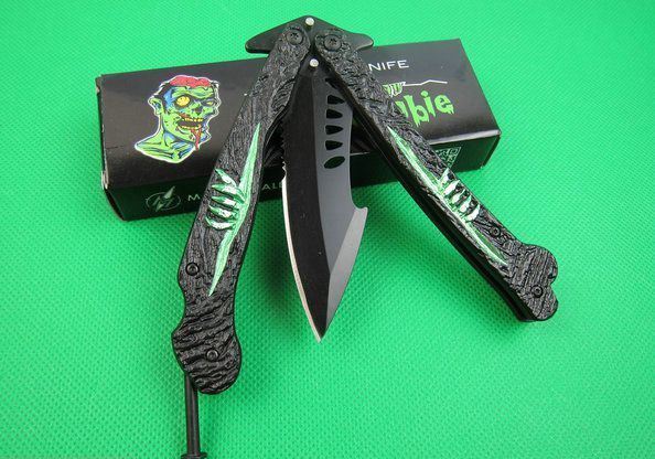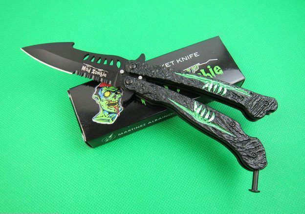 魔爪僵尸出没甩刀 全 长:22.1cm 刃 长:9cm 柄 长:12.5cm 刃 宽:2.8cm 刃 厚:3.0mm 刃 材:3Cr13Mov 重 量:190g(含包装) 硬 度:55HRC 表 面:黑钛 柄 材:钢柄+铝片 锁 型:甩刀 其 他:配彩盒