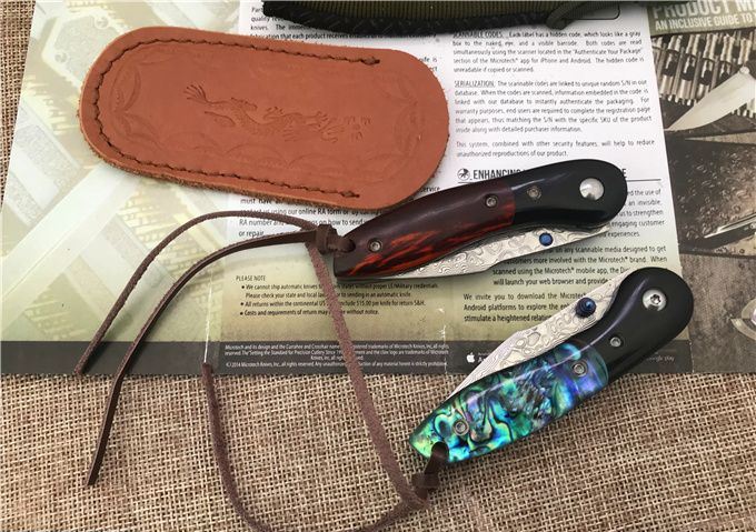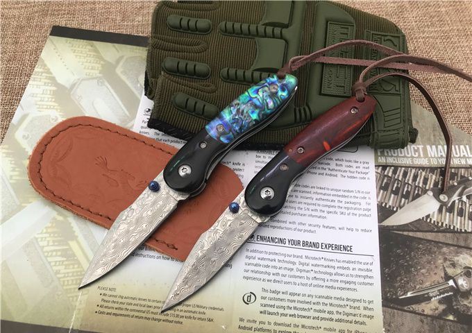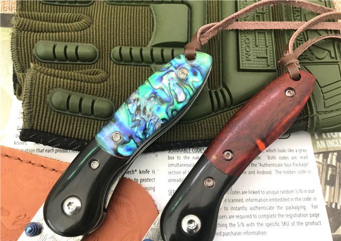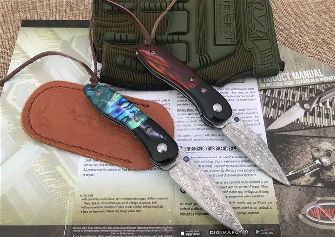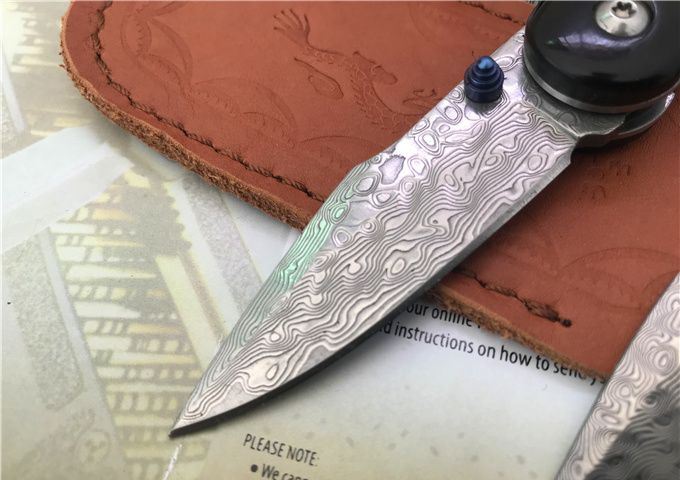 小彩鱼大马士革折刀 全长:14.6cm 刃长:6.1cm 柄长:8.5cm 刃宽:1.8cm 刃厚:2.5mm 刃材:VG10大马士革钢 硬度:60HRC 表面:大马士革原纹 柄材:花酸枝木或贝壳+黑檀木 锁型:侧锁 其他:加厚黑盒+真皮套