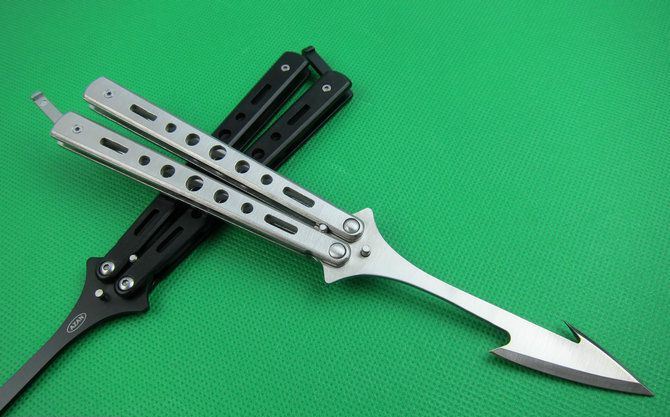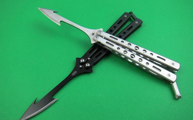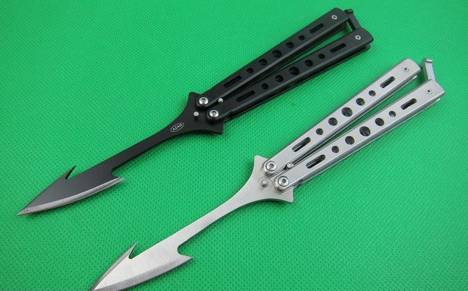 蝴蝶.黑白双箭 全 长:22.5cm 刃 长:5.2cm 柄 长:12.2cm 刃 宽:1.9cm(最宽处) 刃 厚:2.2mm 刃 材:440 硬 度:56HRC 刀 柄:钢柄 表 面:砂光,发黑两色,购买时要注明,不注明随机发货. 重 量:130.0克 配尼龙袋,原厂包装