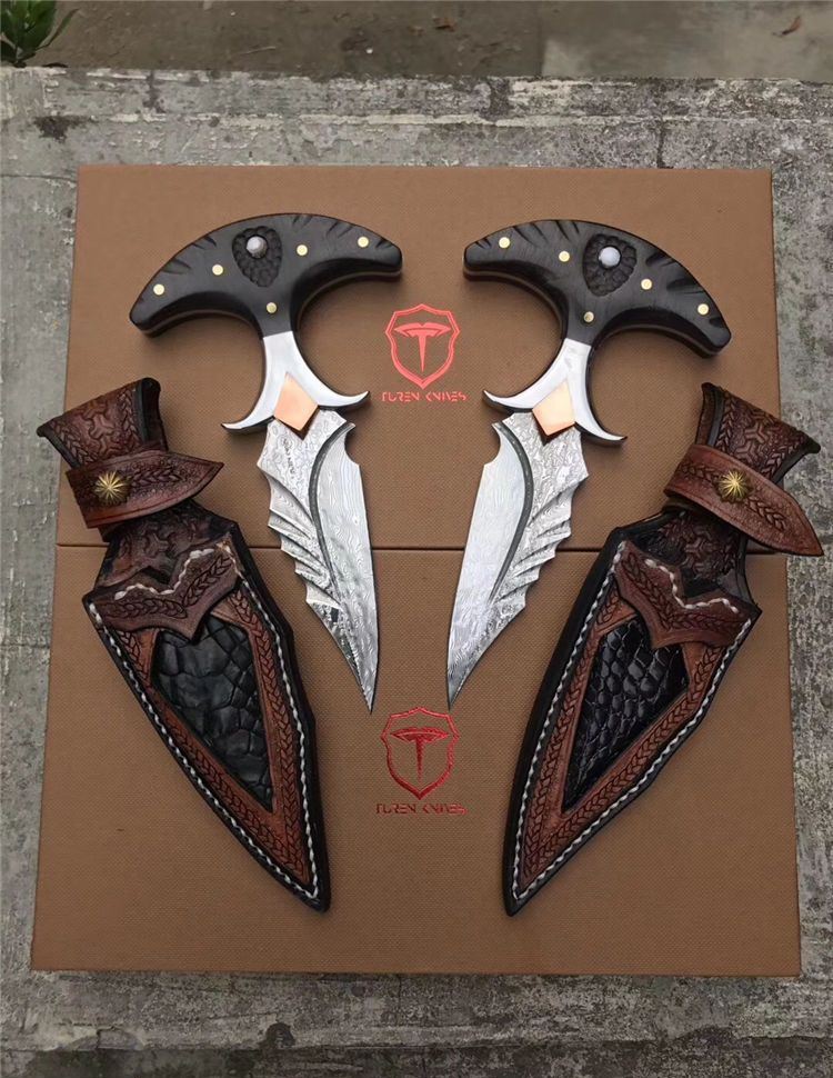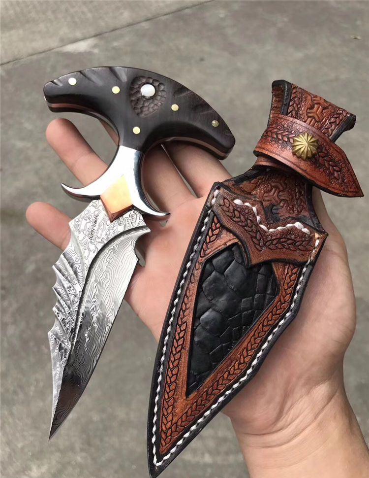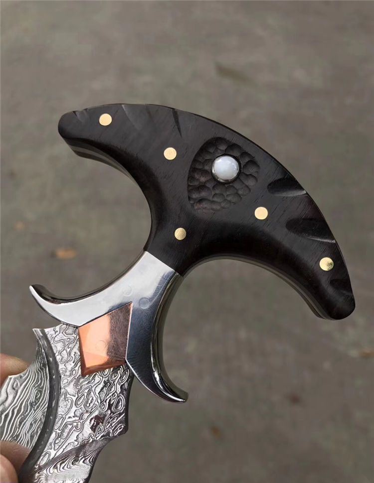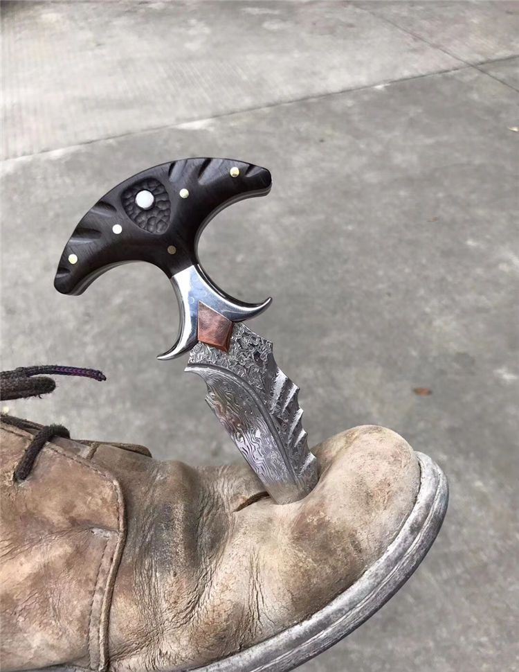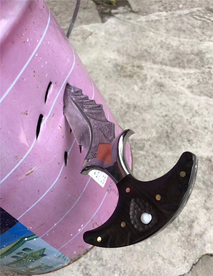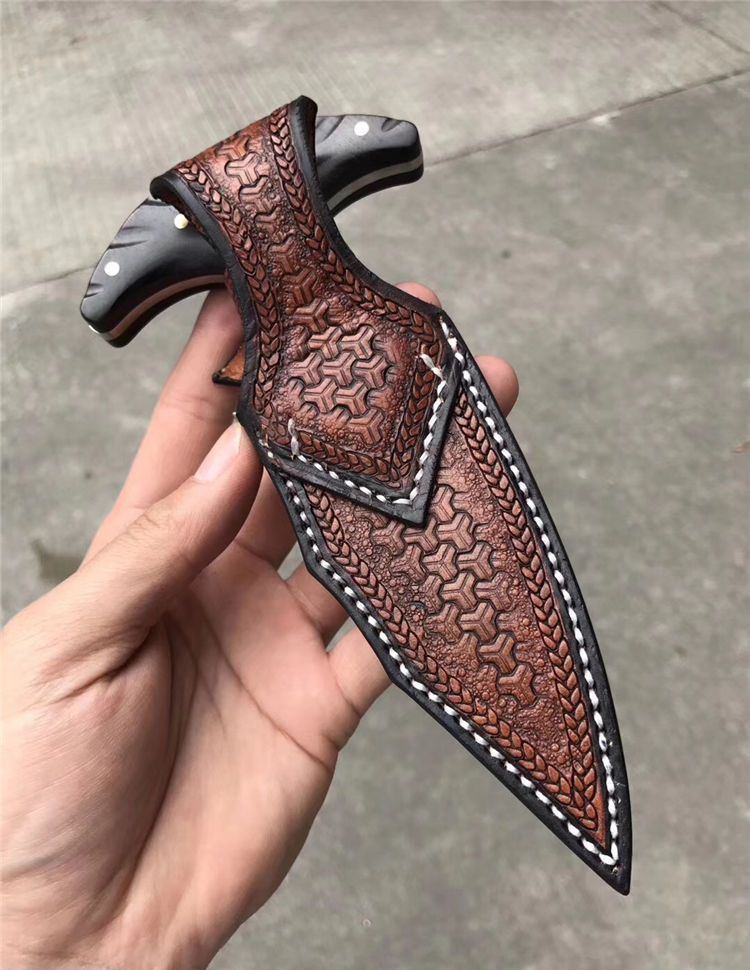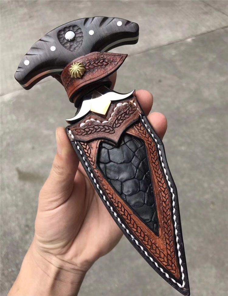 高端TUREN雅刺大马士革手刺 总长:27.3cm 刃长:8.8cm 刃厚:4MM 刃宽:3.8cm 钢材:日本进口锻造大马士革钢102层,不带钢芯 硬度:60HRC、真空深冷热处理 柄材:进口黑檀木镶珍珠贝壳+铜钉固定刮花工艺 挡手:合金钢+紫铜 皮套:阿根廷进口植鞣雕花皮(纯手工镶嵌鳄鱼皮,手工缝线雕花)非常高端大气!送了佳品! 包装:复古硬礼盒包装,内带海绵UVA垫!
