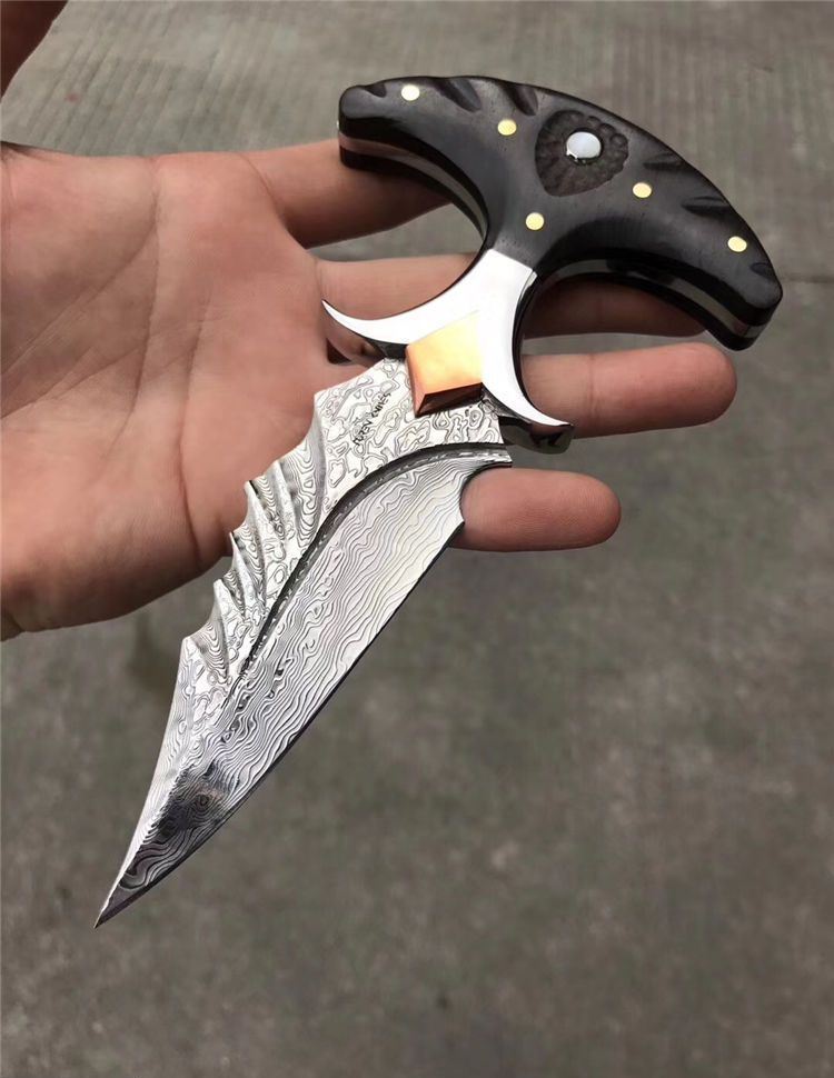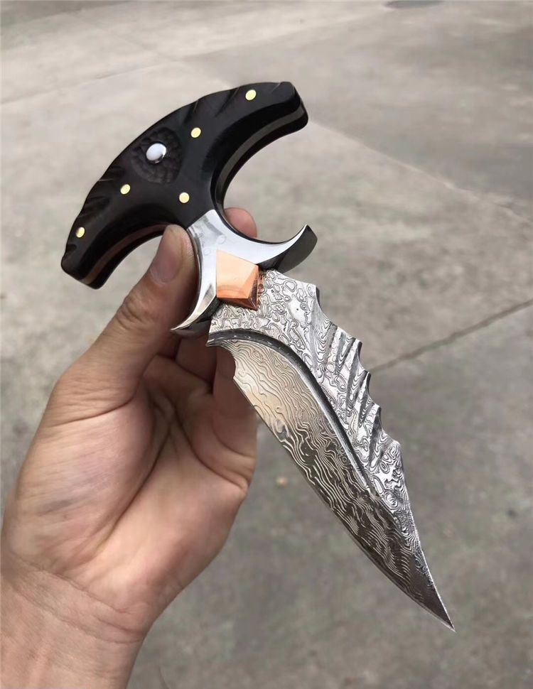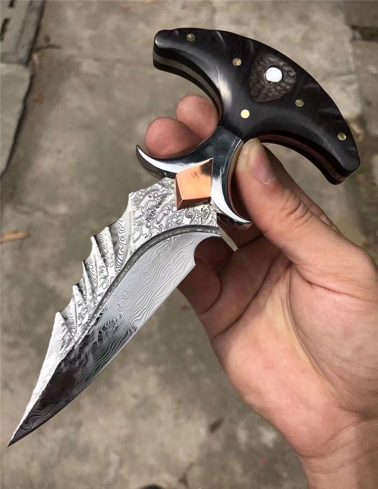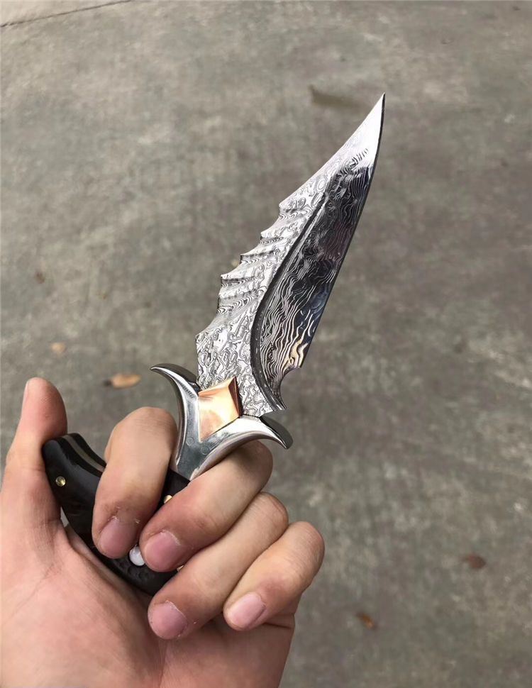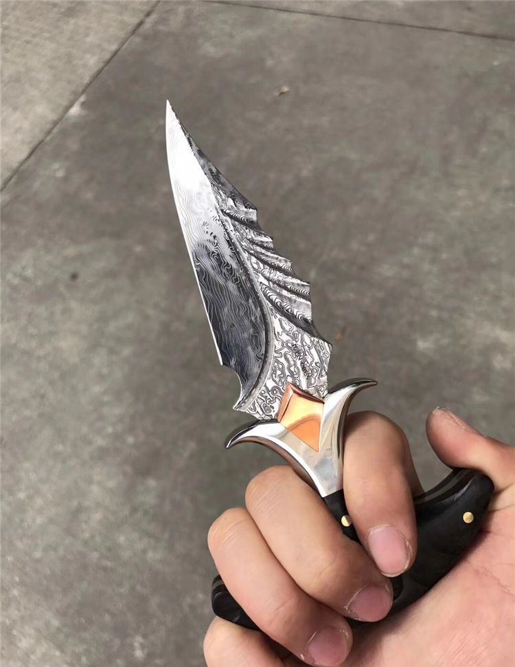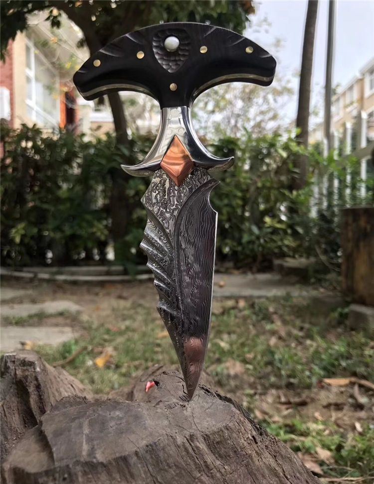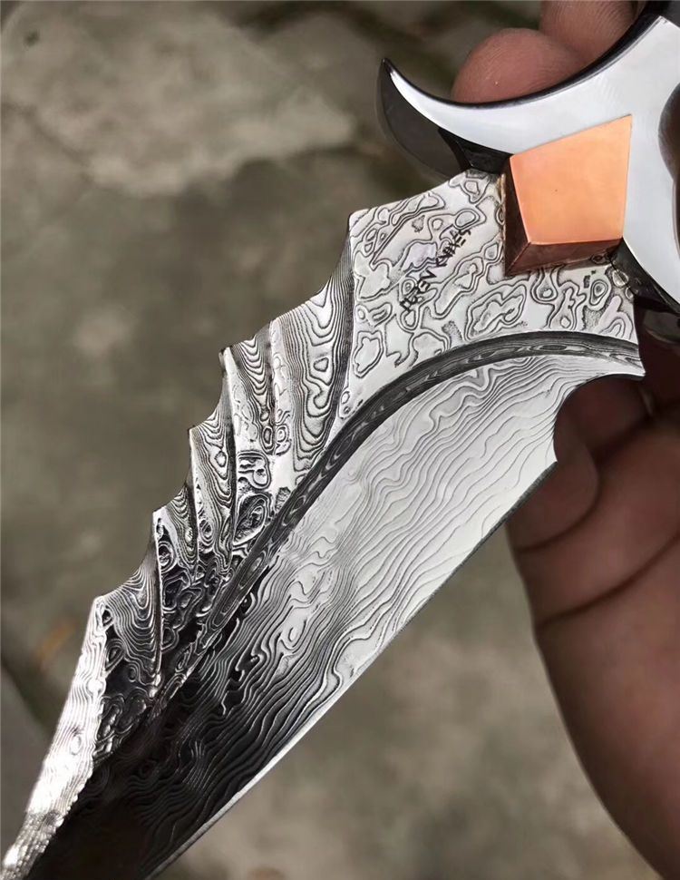 高端TUREN雅刺大马士革手刺 总长:27.3cm 刃长:8.8cm 刃厚:4MM 刃宽:3.8cm 钢材:日本进口锻造大马士革钢102层,不带钢芯 硬度:60HRC、真空深冷热处理 柄材:进口黑檀木镶珍珠贝壳+铜钉固定刮花工艺 挡手:合金钢+紫铜 皮套:阿根廷进口植鞣雕花皮(纯手工镶嵌鳄鱼皮,手工缝线雕花)非常高端大气!送了佳品! 包装:复古硬礼盒包装,内带海绵UVA垫!