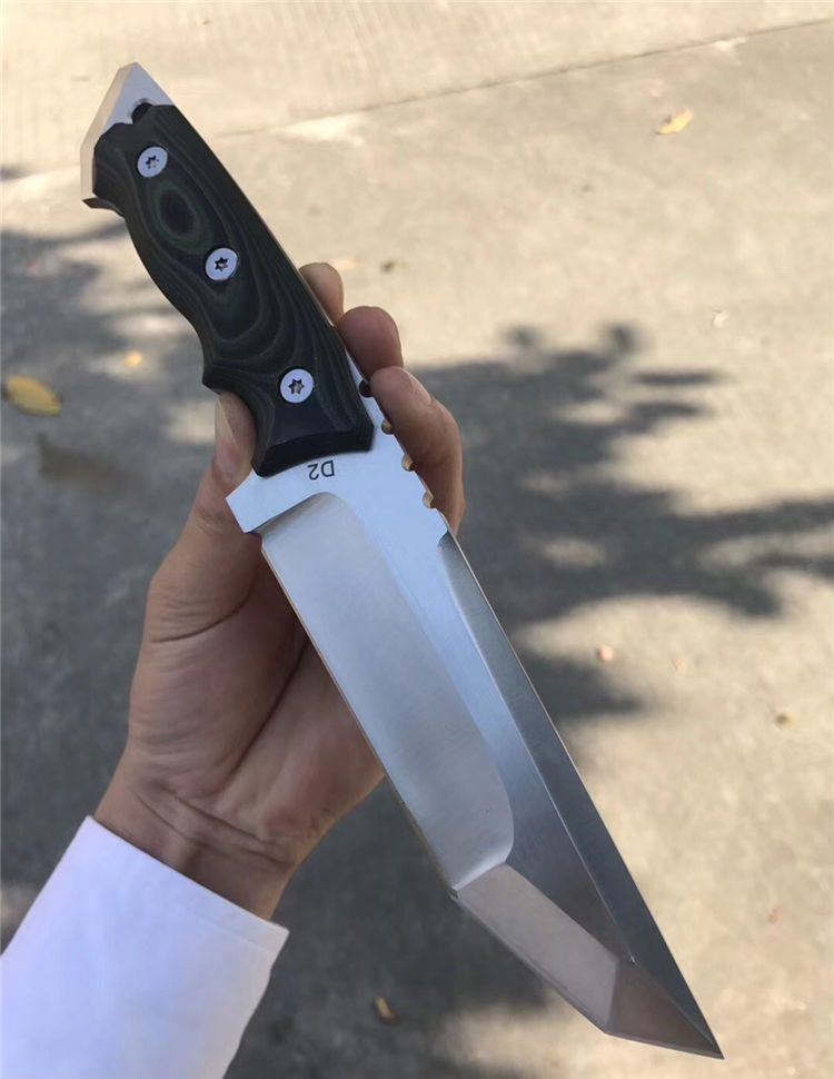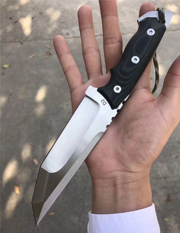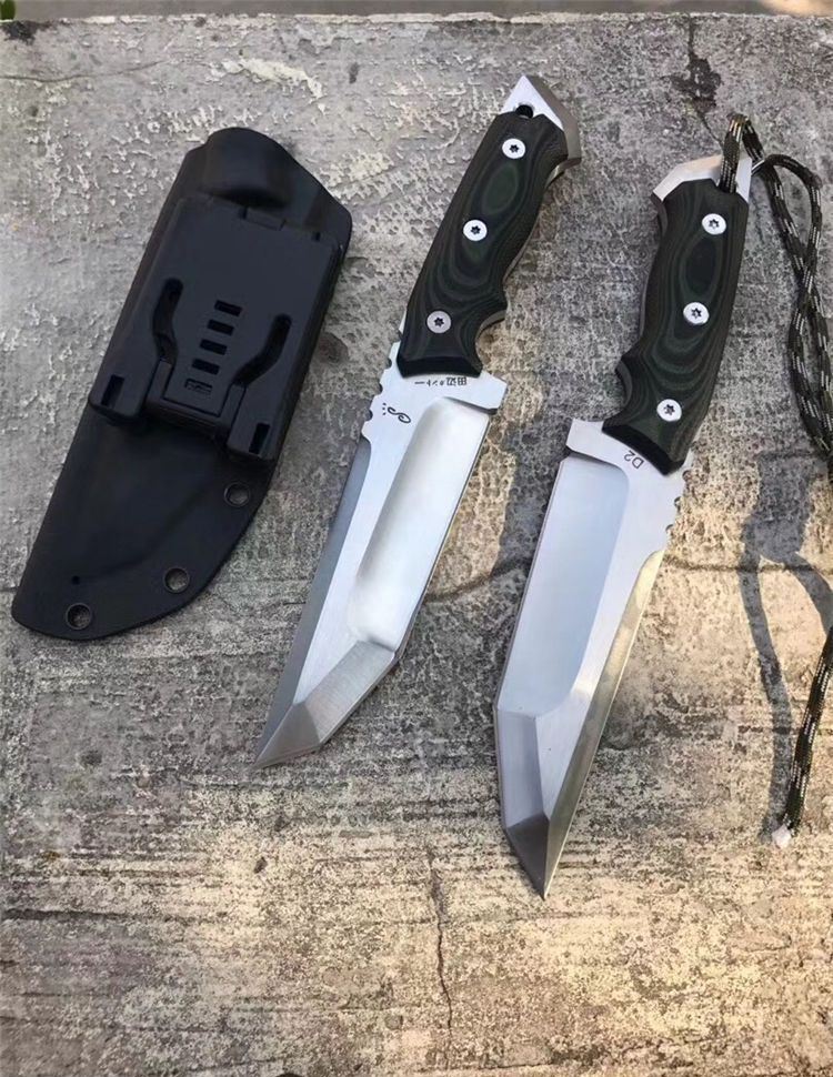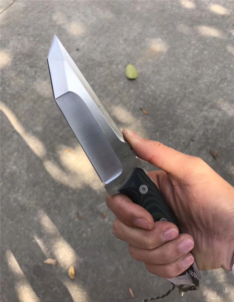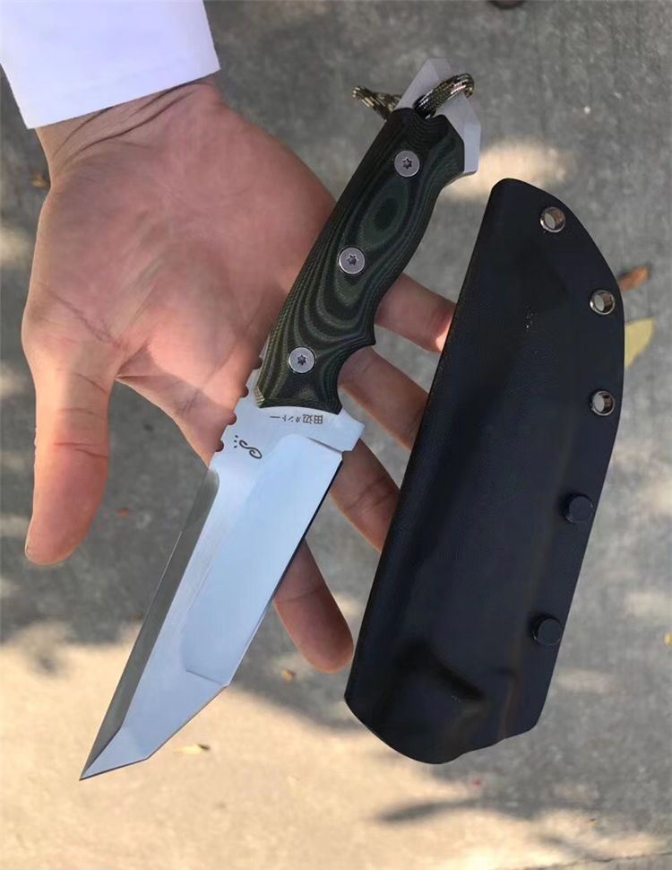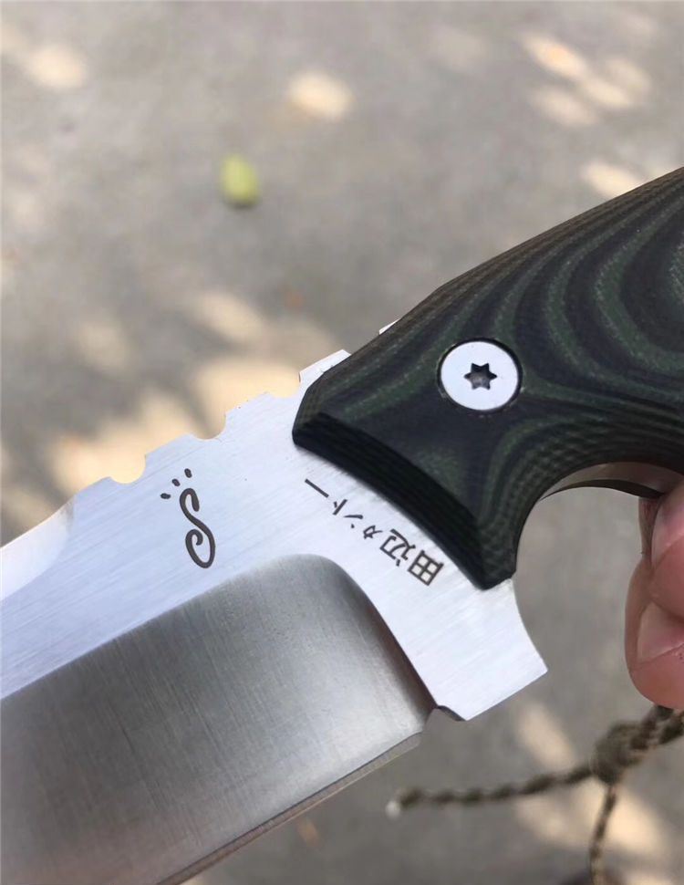 田边一筹直刀 钢材:进口D2钢 总长:24.5左右 刃宽:3.5cm 刃长:12.5cm 刃厚:6MM 表面处理:砂光 硬度:60-61HRC,真空深冷热处理 柄材:黑绿G10 开刃方式:水冷二次开刃