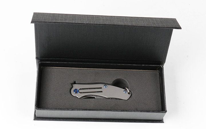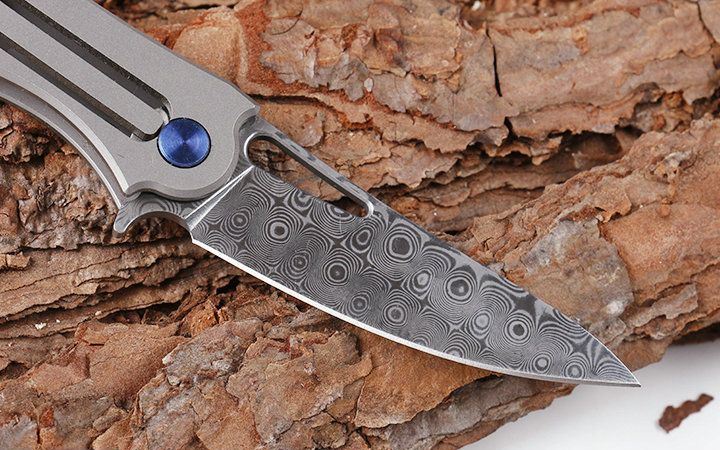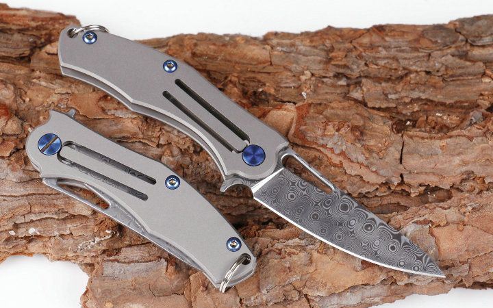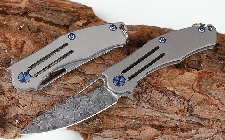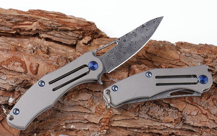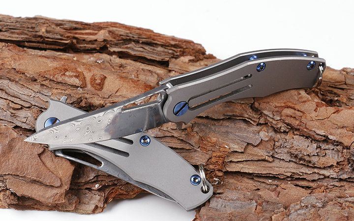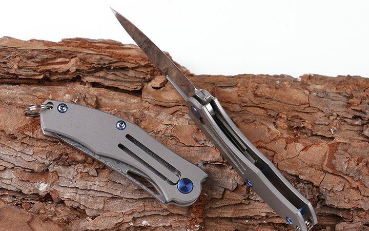 小巧玲珑瑞粉大马平面折刀 全长:12.3cm 刃长:5.3cm 柄长:7.3cm 刃宽:1.7cm 刃厚:2.2mm 刃材:VG10大马士革钢 重量:95g(含包装) 硬度:56-57HRC 表面:瑞粉大马士革原纹 柄材:CT4钛柄 锁型:侧锁 其他:黑色礼品盒
