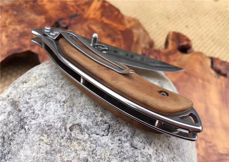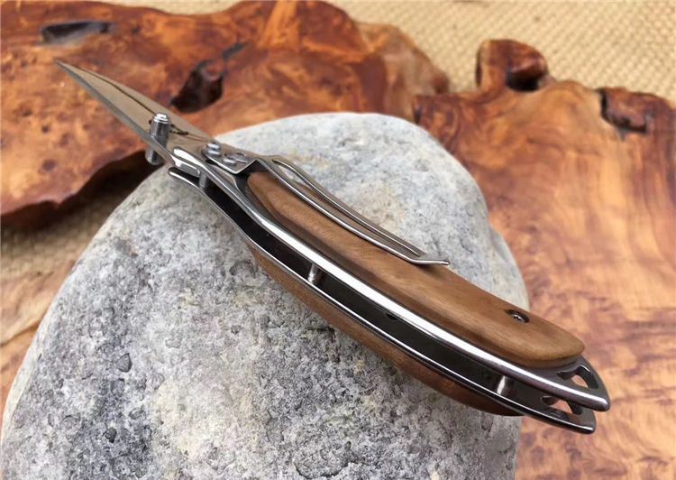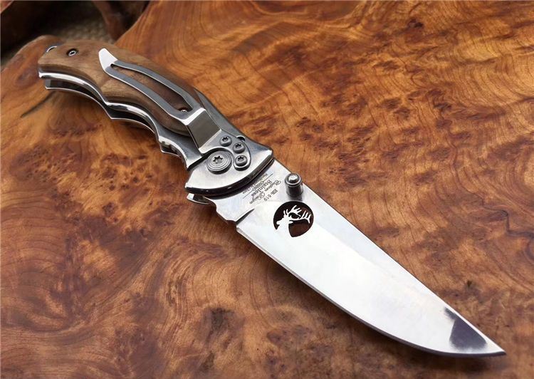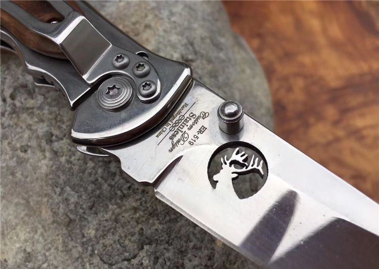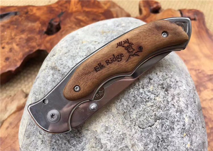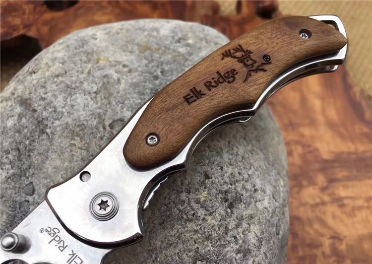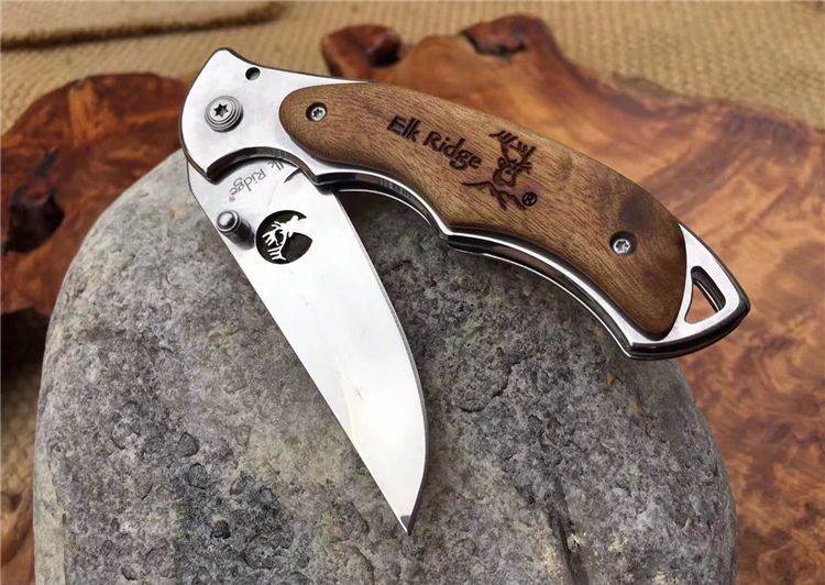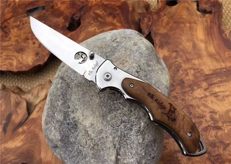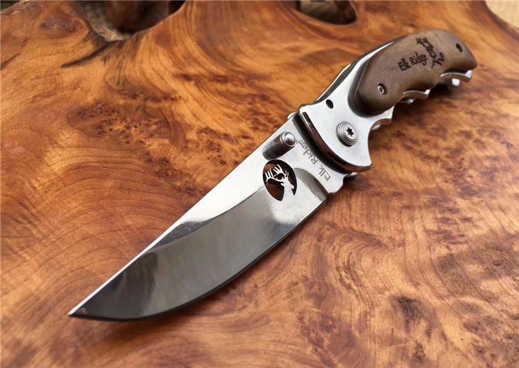 野鹿ER519折刀 全 长: 19.5cm 刃 长: 7.8cm 柄 长: 11.5cm 刃 宽: 2.3cm(最宽处) 硬 度: 56HRC 刃 厚: 0.2cm 柄 材: 两面原木 重 量: 139克(含刀套) 刃 材: 440 表 面: 镜光