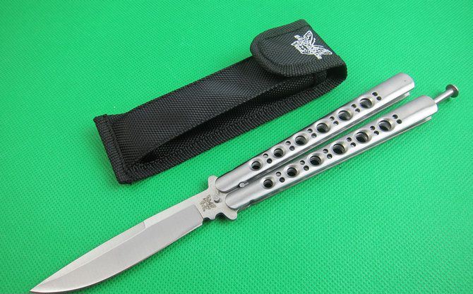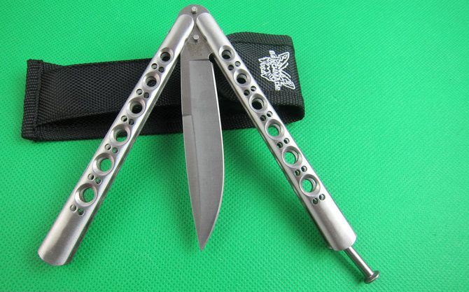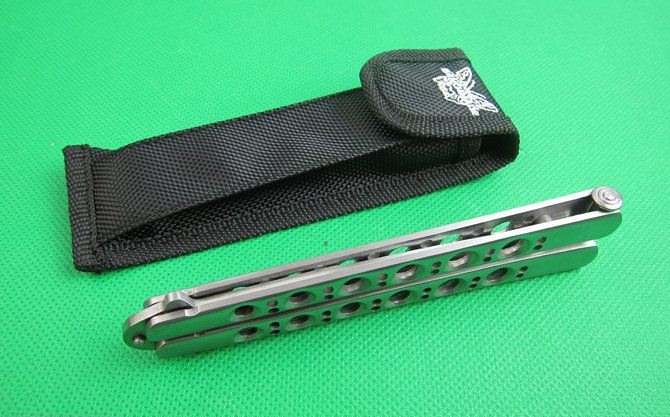 蝴蝶.BM42C甩刀(铆钉免维护) 全 长:24.0cm 刃 长:9.2cm 柄 长:13.5cm 刃 宽:1.9cm(最宽处) 刃 厚:2.8mm 刃 材:440C 硬 度:56HRC 刀 柄:钢柄 表 面:砂光 重 量:190.0克(含包装) 配尼龙袋,原厂包装