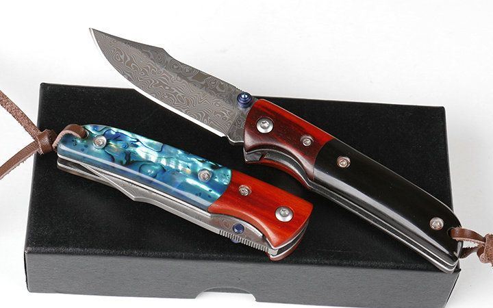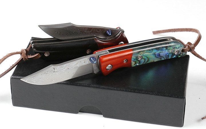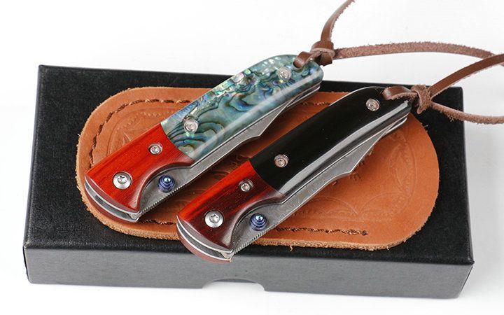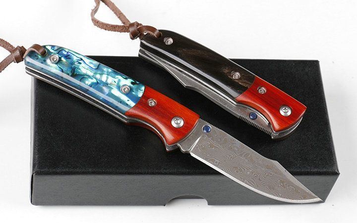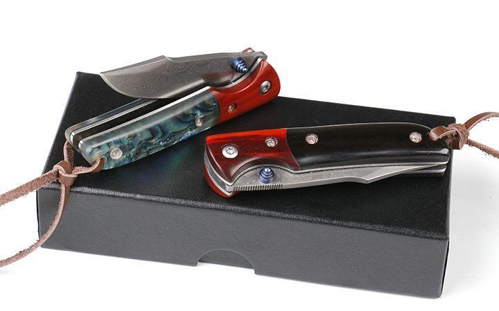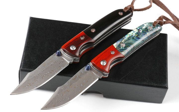 小刺客大马士革折刀 全长:14.5cm 刃长:6.4cm 柄长:8.1cm 刃宽:1.8cm 刃厚:2.8mm 刃材:VG10大马士革钢 重量:100g(含包装) 硬度:56-57HRC 表面:VG10大马士革原纹 柄材:科檀头+黑牛角.科檀头+天然彩鲍贝 锁型:侧锁 其他:黑色礼品盒+真皮套,出口装