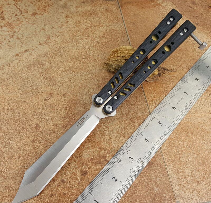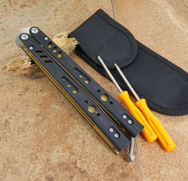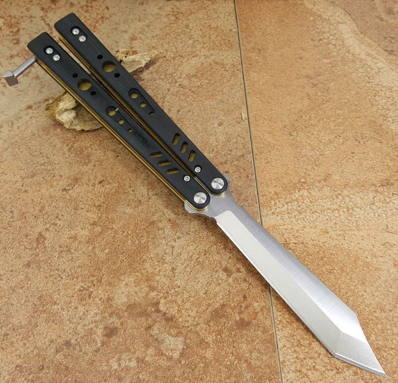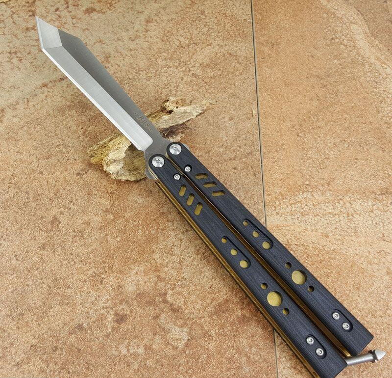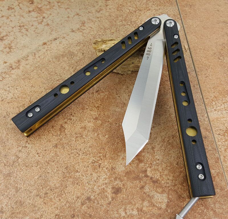 the one BRS黑金蝴蝶甩刀 全长:254MM 刃长:114MM 开刃长:107MM" 刃厚:3.5MM 刃材料:D2 刃型:tanto 柄长:140MM 柄厚:14MM 柄材料:G-10 柄颜色:黑/金 柄内衬:钛 重量:150克 BRS系列,bushing轴套系统,搭配钛内衬,G10轻质高强手柄,重量只有150克。转动非常顺畅,D2刃材,数控精磨