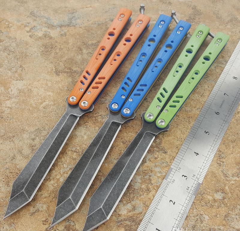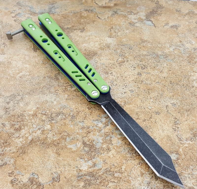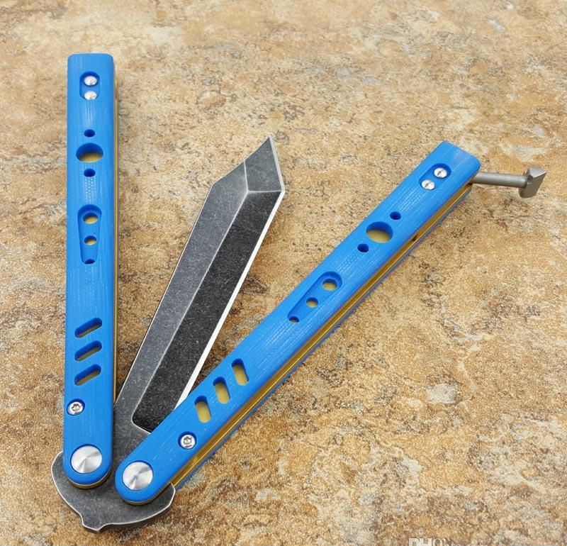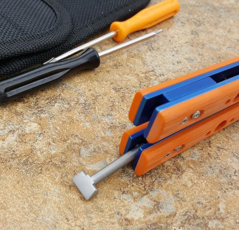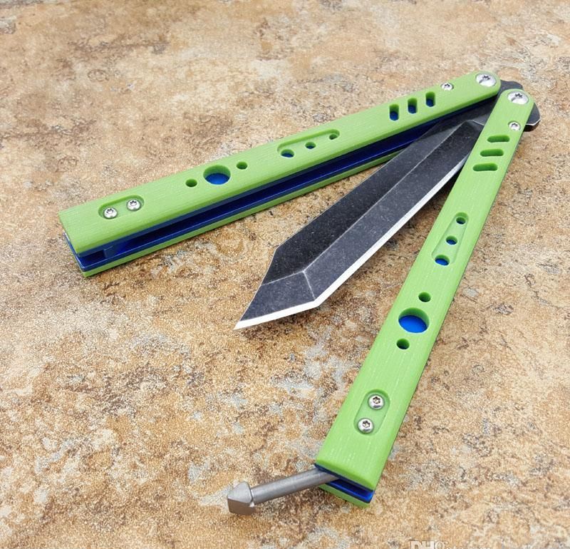 the one BRS蝴蝶甩刀三色 全长:254MM 刃长:114MM 开刃长:107MM" 刃厚:3.5MM 刃材料:D2 刃型:tanto 柄长:140MM 柄厚:14MM 柄材料:G-10 柄颜色:绿色,橙色,兰色 柄内衬:钛 重量:150克 BRS系列,bushing轴套系统,搭配钛内衬,G10轻质高强手柄,重量只有150克。转动非常顺畅,D2刃材,数控精磨