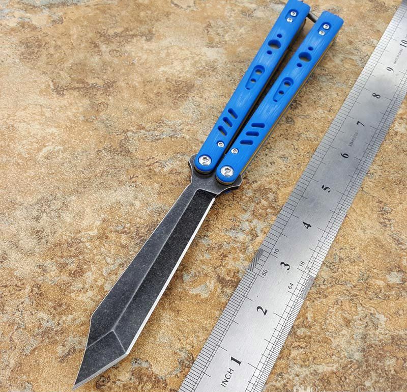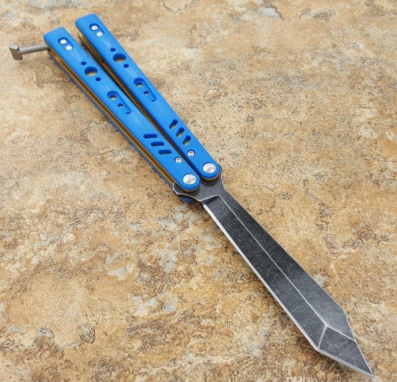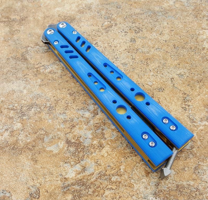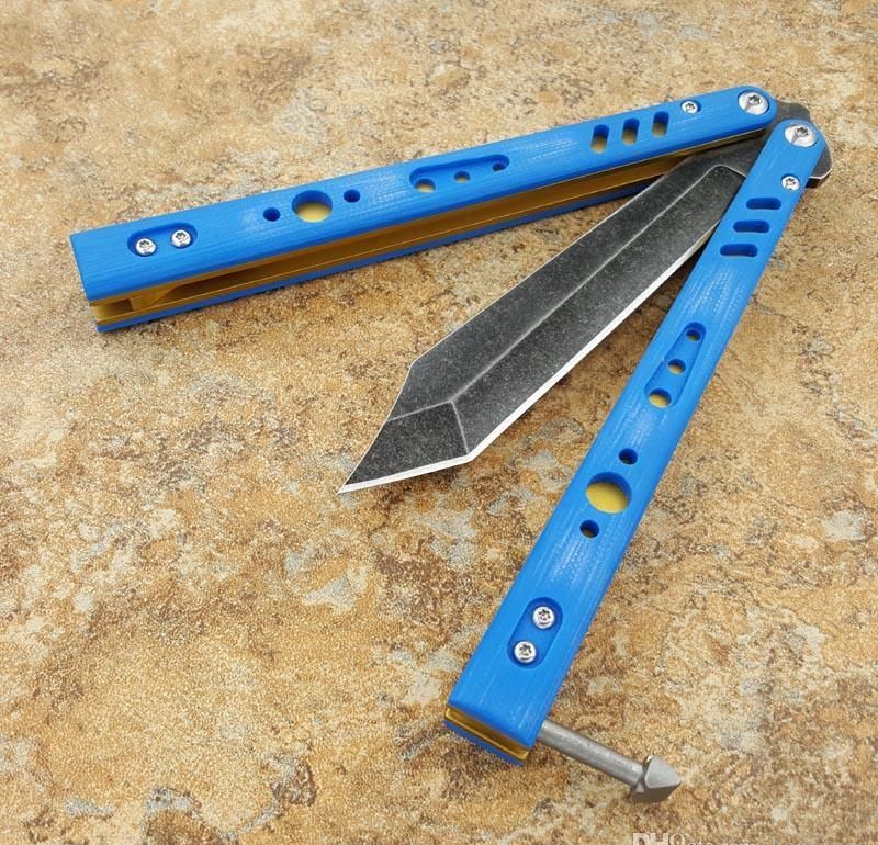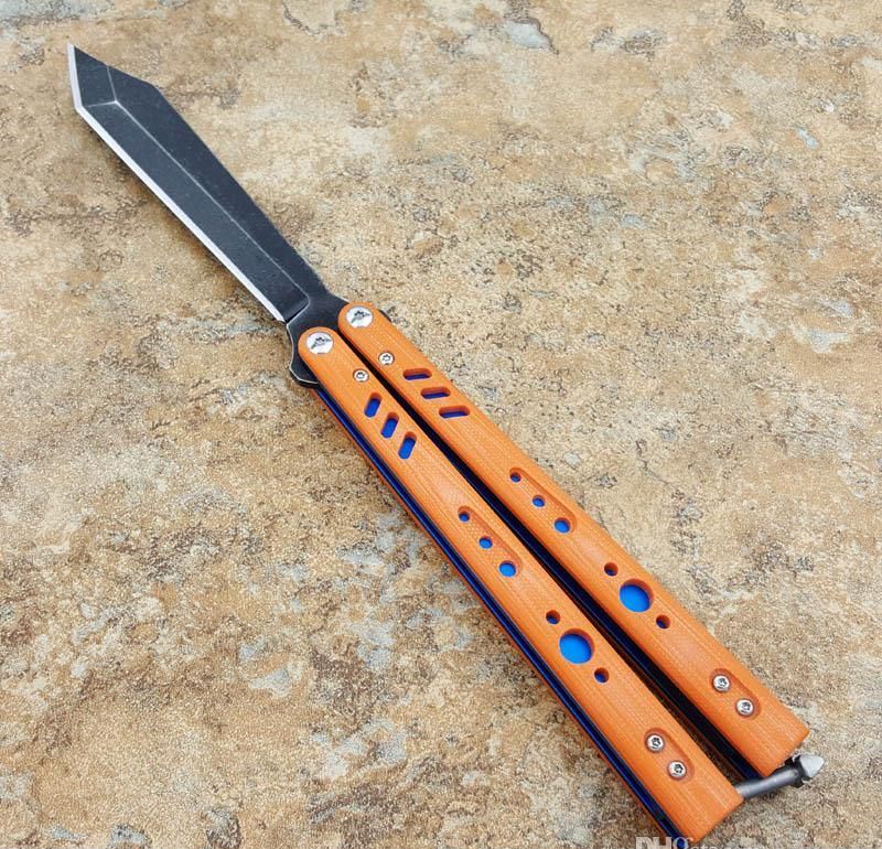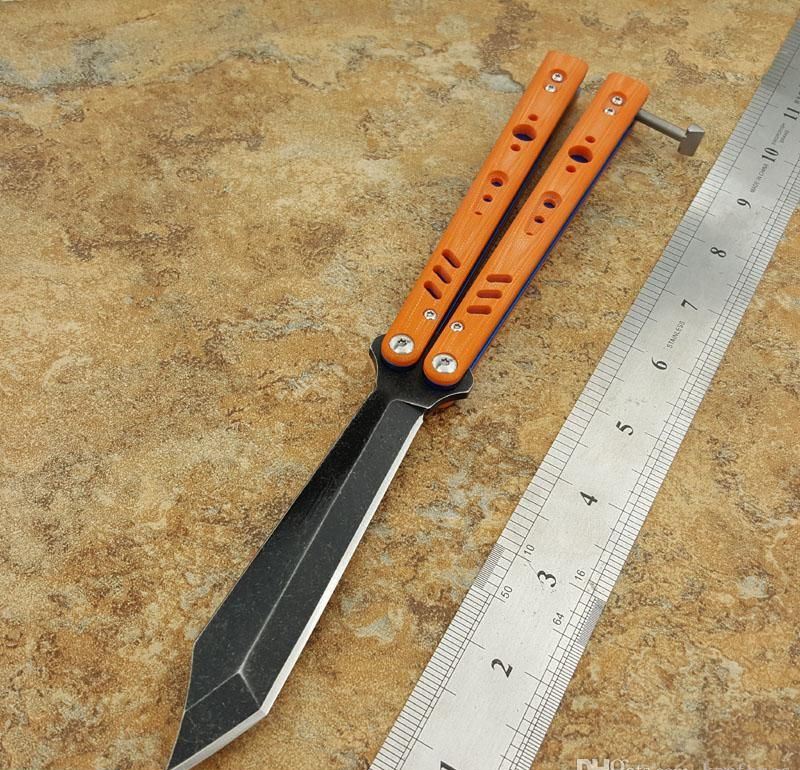 the one BRS蝴蝶甩刀三色 全长:254MM 刃长:114MM 开刃长:107MM" 刃厚:3.5MM 刃材料:D2 刃型:tanto 柄长:140MM 柄厚:14MM 柄材料:G-10 柄颜色:绿色,橙色,兰色 柄内衬:钛 重量:150克 BRS系列,bushing轴套系统,搭配钛内衬,G10轻质高强手柄,重量只有150克。转动非常顺畅,D2刃材,数控精磨