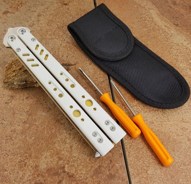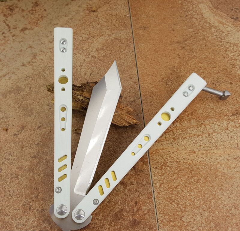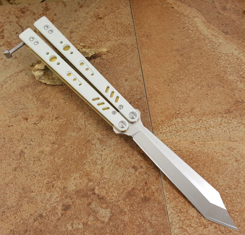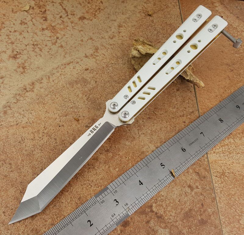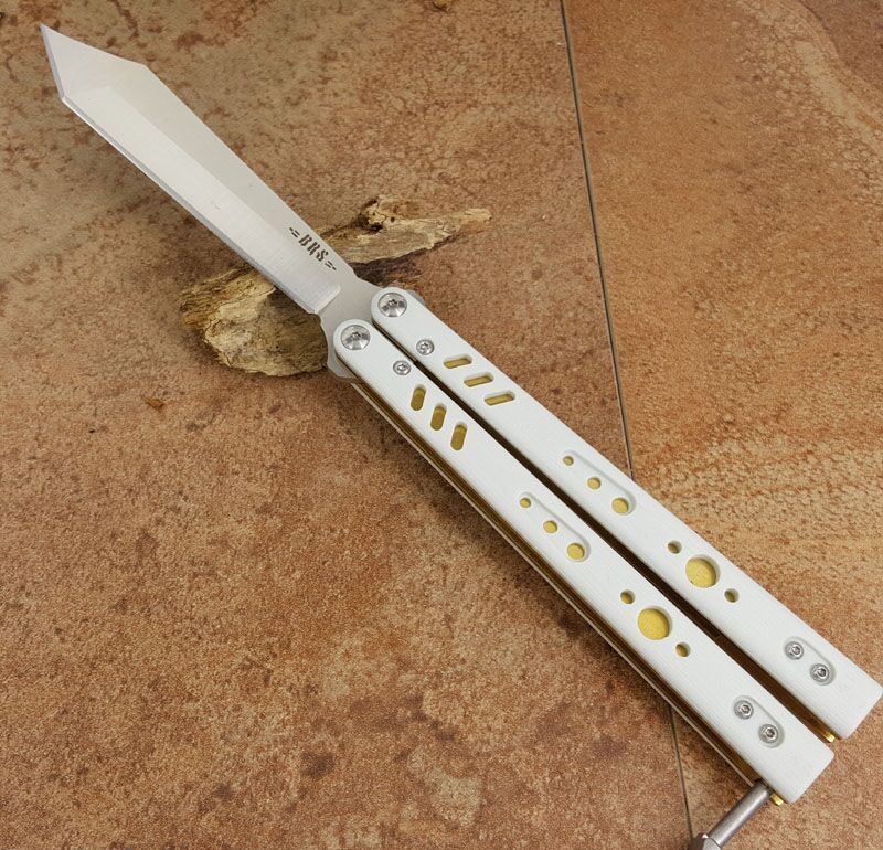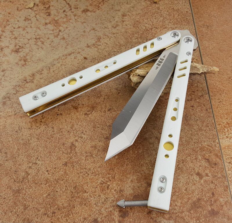 the one BRS白金蝴蝶甩刀 全长:254MM 刃长:114MM 开刃长:107MM" 刃厚:3.5MM 刃材料:D2 刃型:tanto 柄长:140MM 柄厚:14MM 柄材料:G-10 柄颜色:白/金 柄内衬:钛 重量:150克 BRS系列,bushing轴套系统,搭配钛内衬,G10轻质高强手柄,重量只有150克。转动非常顺畅,D2刃材,数控精磨