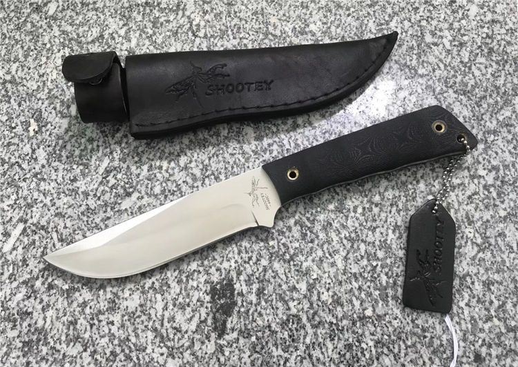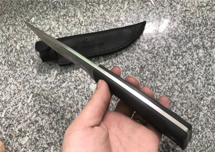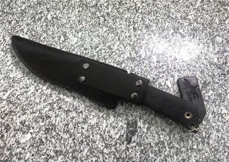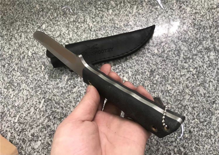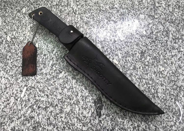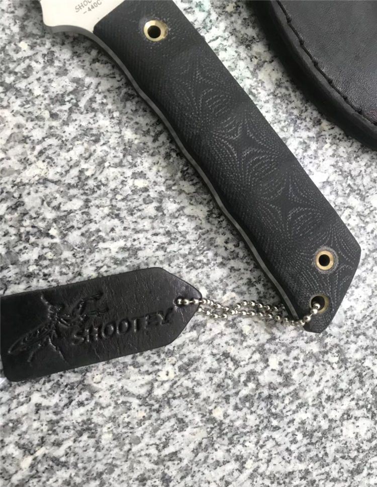 Shootey螳螂青蜂侠直刀 全长:26.0cm 刃长:12.0cm 刃宽:3.2cm 刃厚:4.0mm 刃材:440C 高级不锈钢 硬度:58HRC 表面:砂光 柄材:黑色亚麻G10 柄长:12.5 cm 鞘材:真皮套 刀重:240克 总重:380克