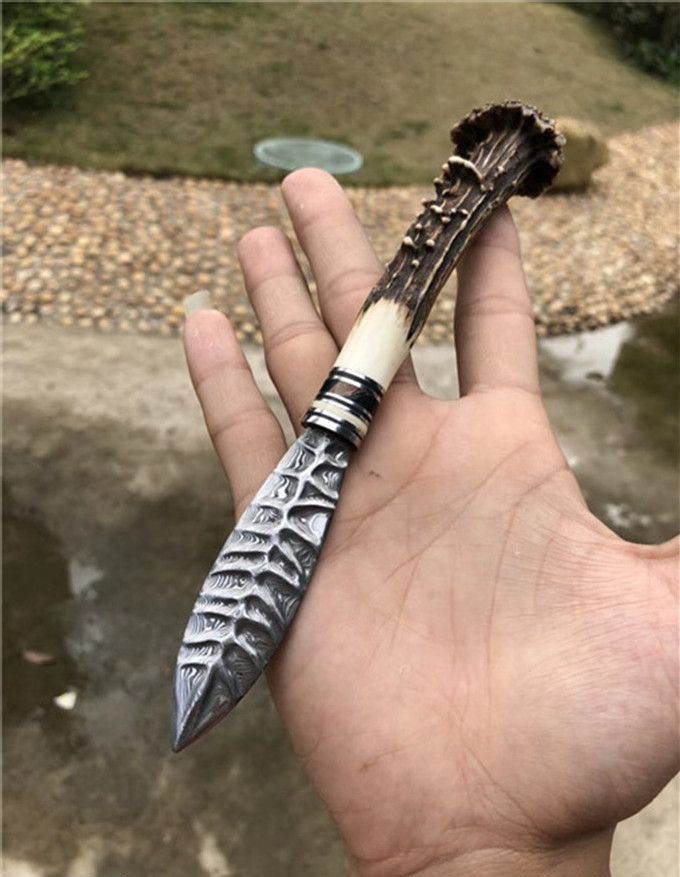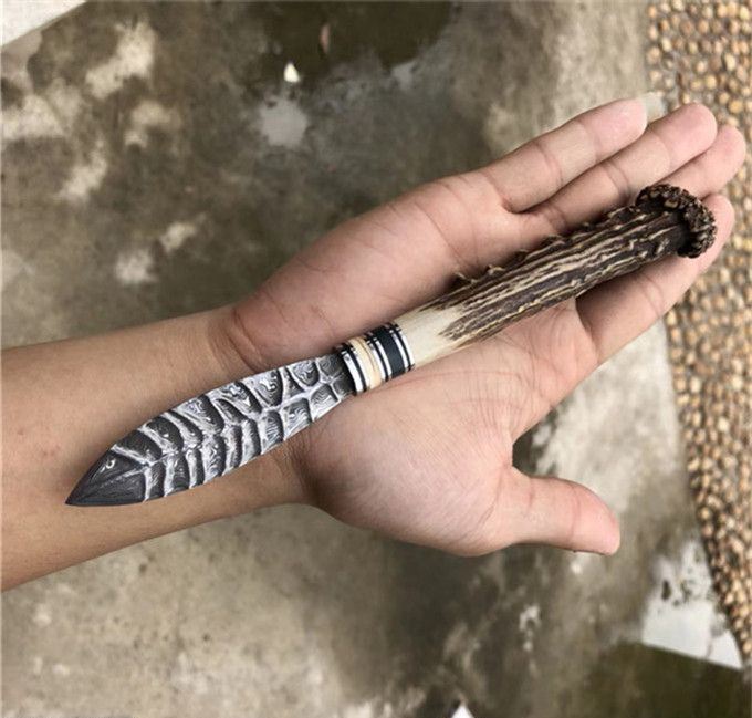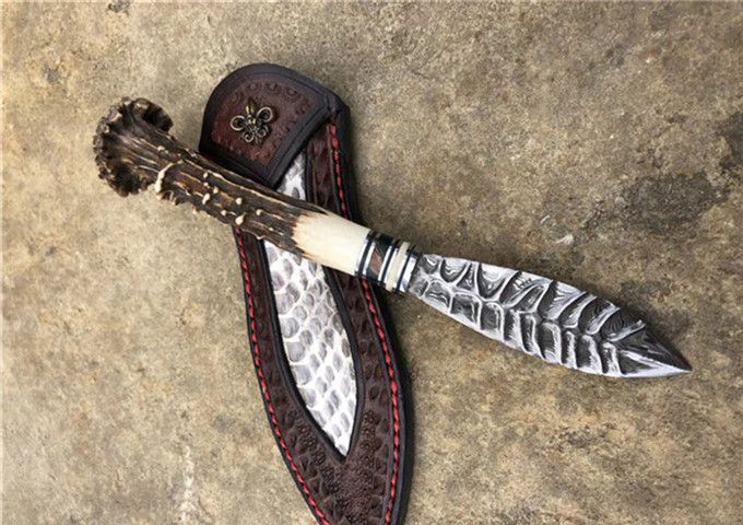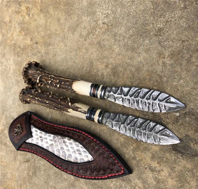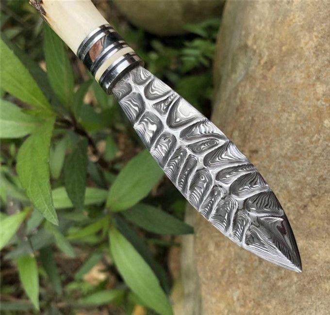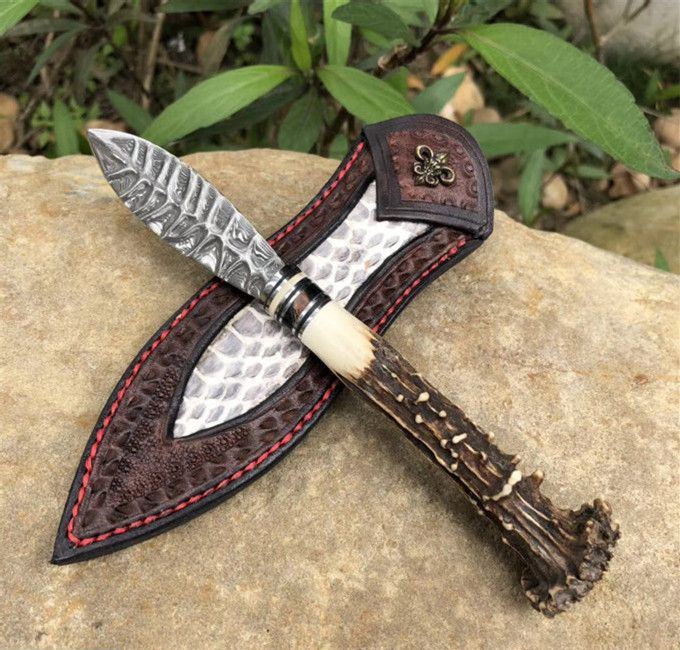 玲珑师叶枫高端手工茶刀 全长:21cm 刃长:8cm 手柄长约:13cm 刃钢材:进口大马士革钢(85层) 刃材厚度:2.5mm,硬度:60HRC 手柄材料:猛犸牙+稳定化木+孢鹿角蘑菇头 皮套:纯手工蟒蛇牛皮套
