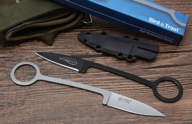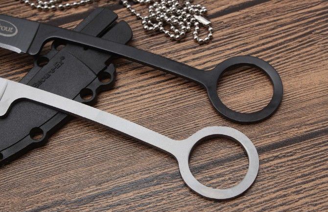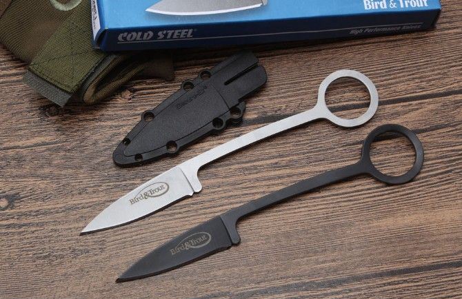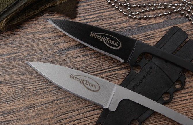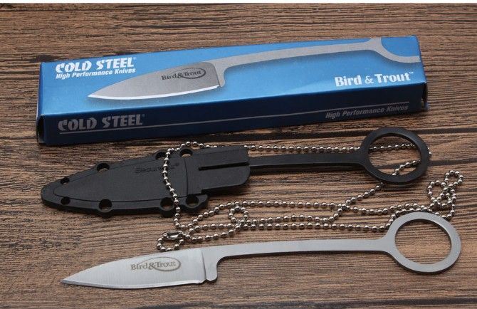 冷钢鳟鱼求生防卫颈刀 全长:16.1cm 刃长:6.cm 刃厚:0.22mm 刃材:5CR13MOV 硬度:57HRC 重量:22克 表面:喷砂 柄材:一体钢 刀鞘:塑料鞘 其它:彩盒带颈链珠