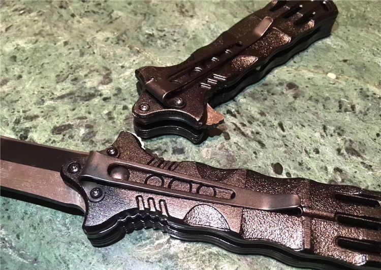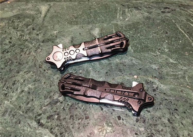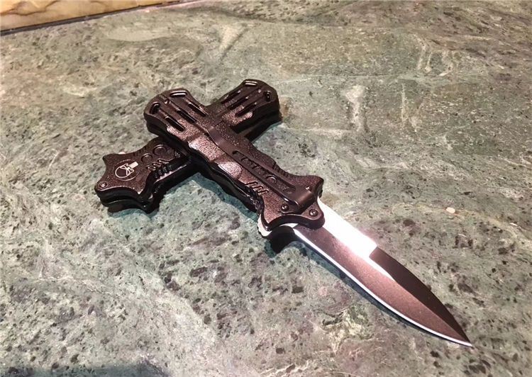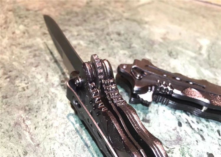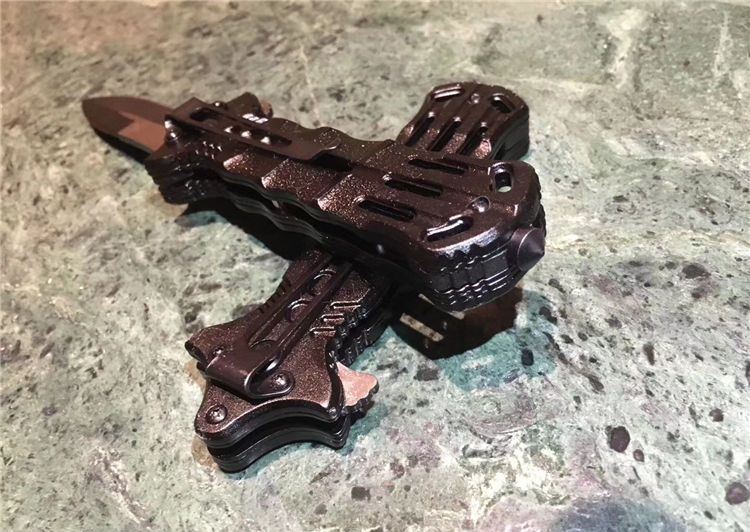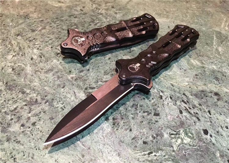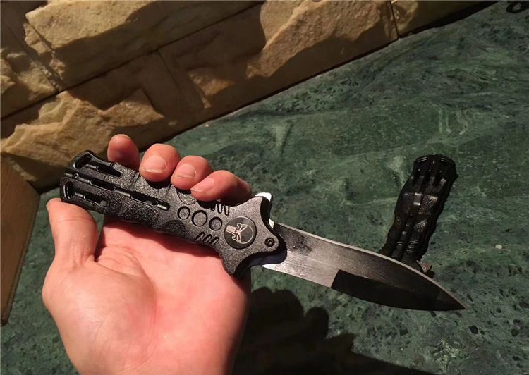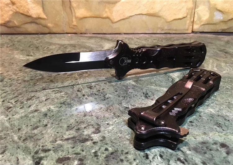全黑鬼头快开折刀 全长:21.5CM 刃长:9CM 刃材:CR13MoV钢 柄材:全钢柄 配件:带求生尾钢锥 重量:185克(净重) 带背夹,可韃携带