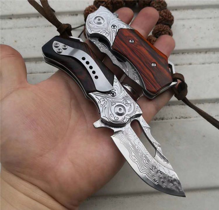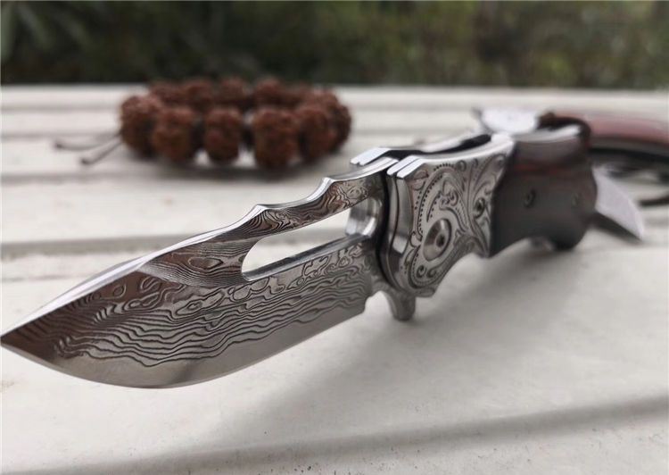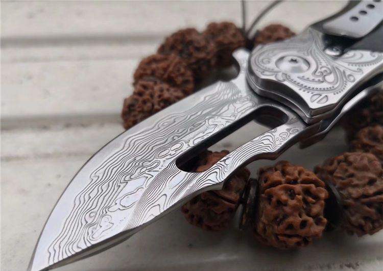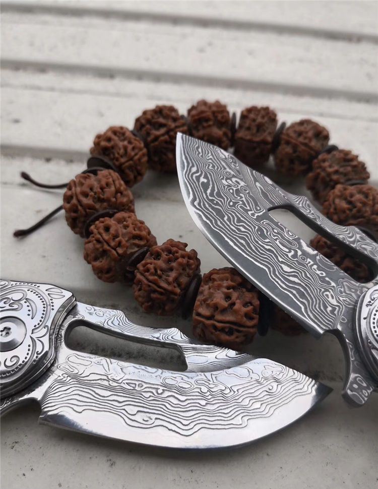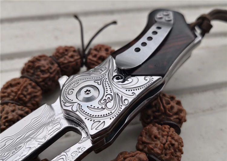该刀选用vg10刃钢大马士革锻打祥云纹,整刀设计厚重。刀刃霸气,一体快开鳍,主轴镶嵌高精度陶瓷滚珠轴承,开合顺滑。刀柄精挑老料黄檀实木,一分为二,精工抛光。刀隔不锈钢刻画唐草花纹,配合不锈钢背夹