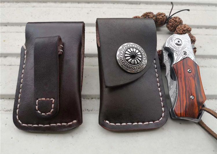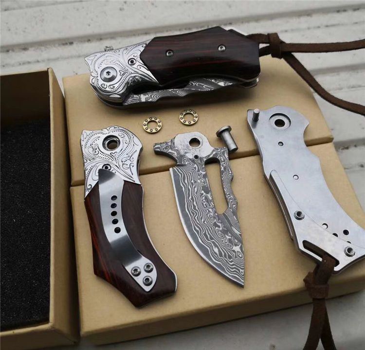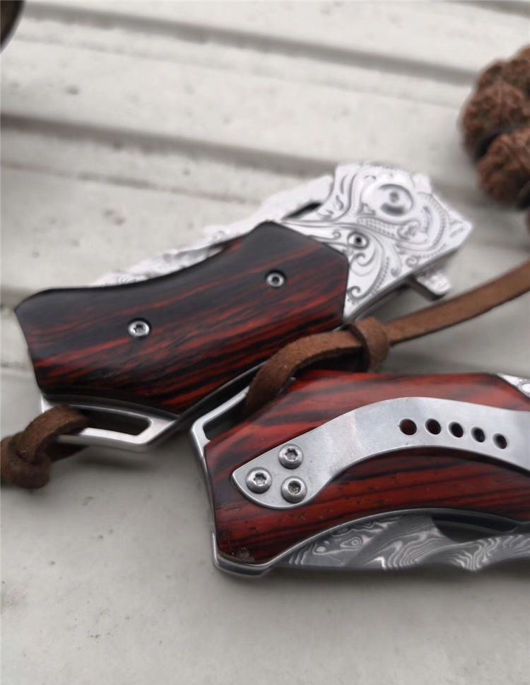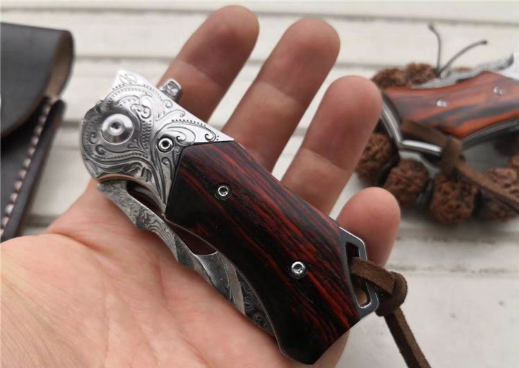 新款小犀牛大马士革折刀 全长:15cm 刃长:6.2cm 刃厚:3.5mm 硬度:60hrc 配置手工牛皮套 该刀选用vg10刃钢大马士革锻打祥云纹,整刀设计厚重。刀刃霸气,一体快开鳍,主轴镶嵌高精度陶瓷滚珠轴承,开合顺滑。刀柄精挑老料黄檀实木,一分为二,精工抛光。刀隔不锈钢刻画唐草花纹,配合不锈钢背夹