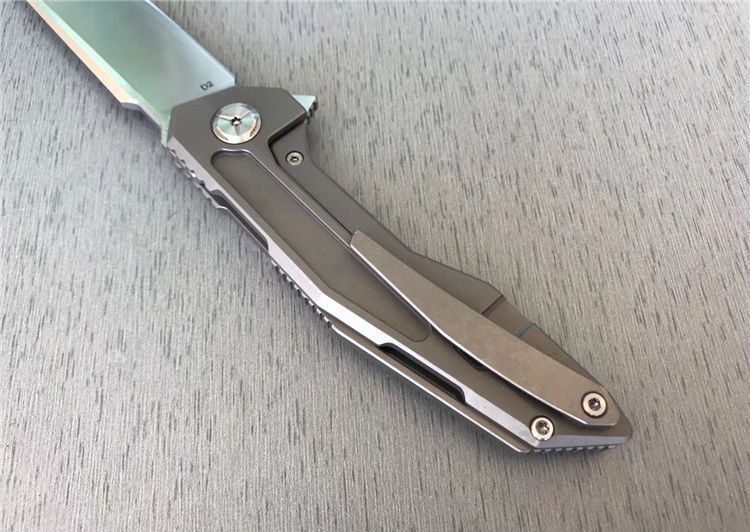 TS42牧马人折刀 总长度:210毫米 刀片长度:85毫米 手柄长度:110毫米 刀片厚度:4毫米 刀片宽度:25.5毫米 刀片材质:D2(房间100%,D2,可以测试) 处理材料:砂光拉丝 柄材:钛合金 刀片处理:缎面 手柄处理:CNC 硬度:58-60 HRC 系统:滚珠轴承系统 净重:130克(误差2克) 其他:纸箱礼品包装