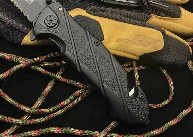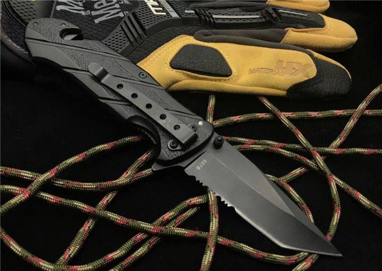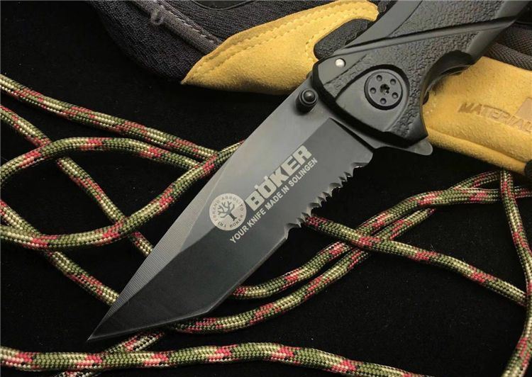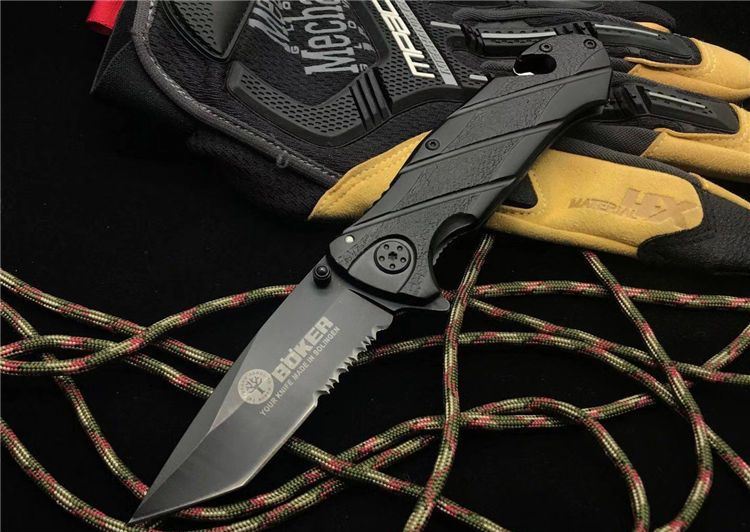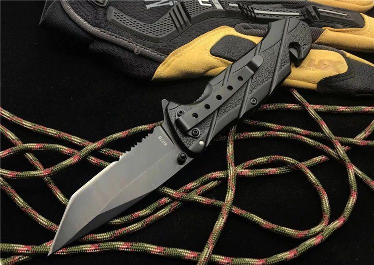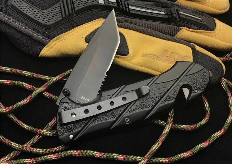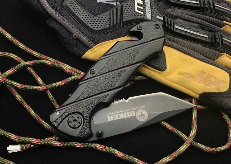 博克607B求生折刀 全长:20.0CM 刃长:8.2CM 刃厚:0.3CM 刃宽:2.4CM (最宽处) 柄长:11.8CM 涂层:黑钛 锁定:坚固线锁 其他:几何刀头,半齿开刃,坚固背夹,把手尾部带救生撞头