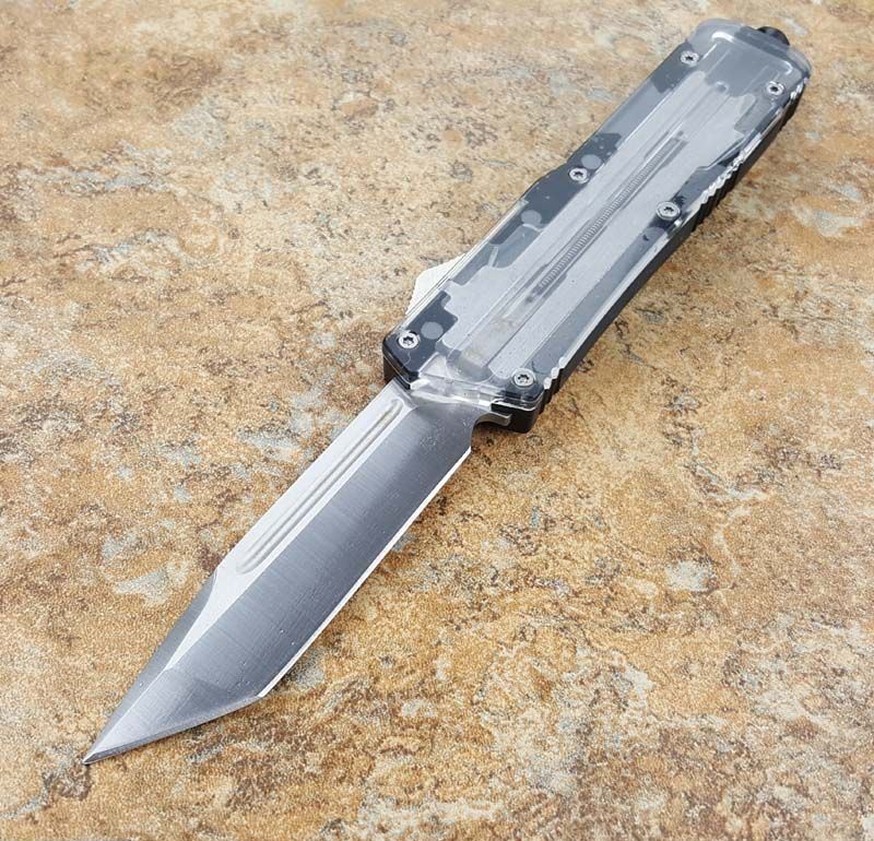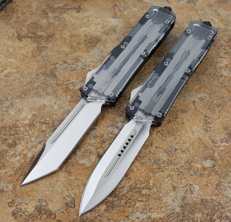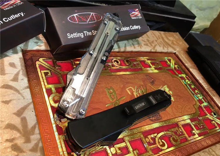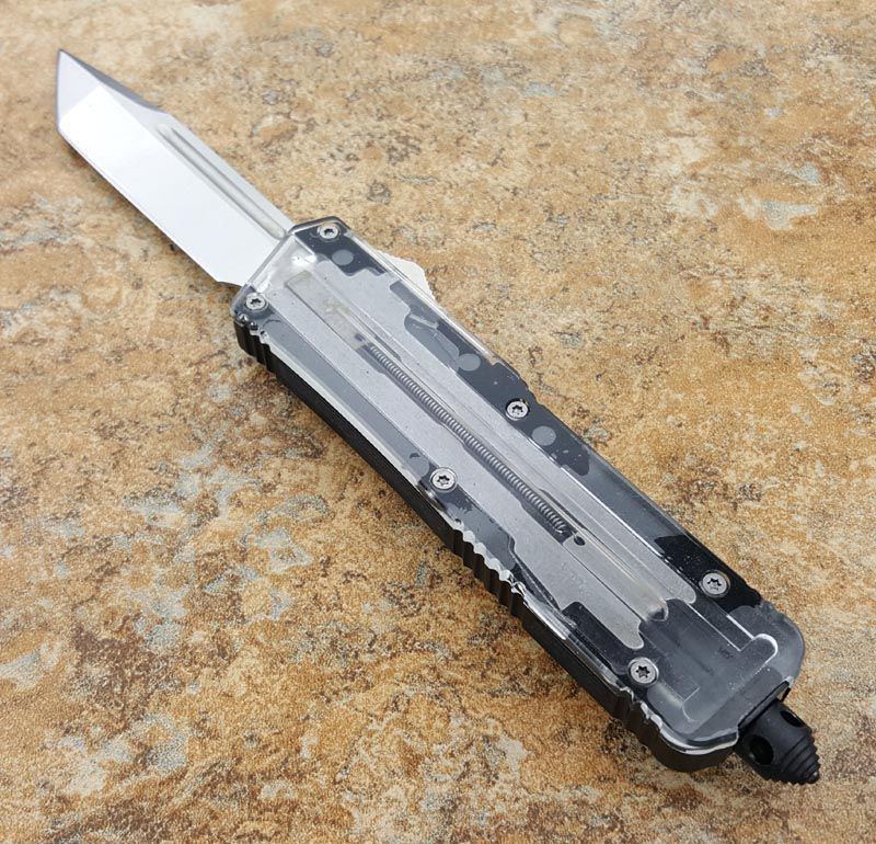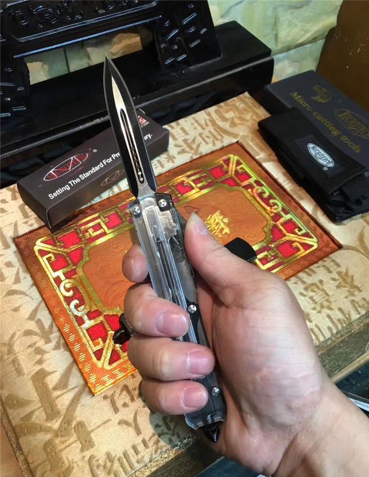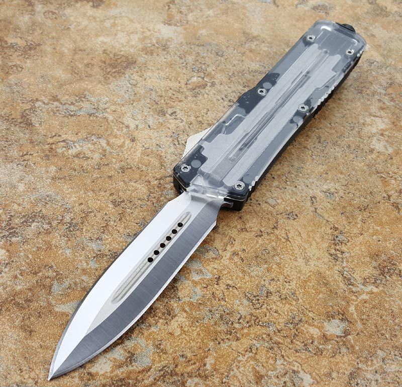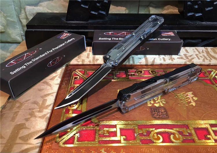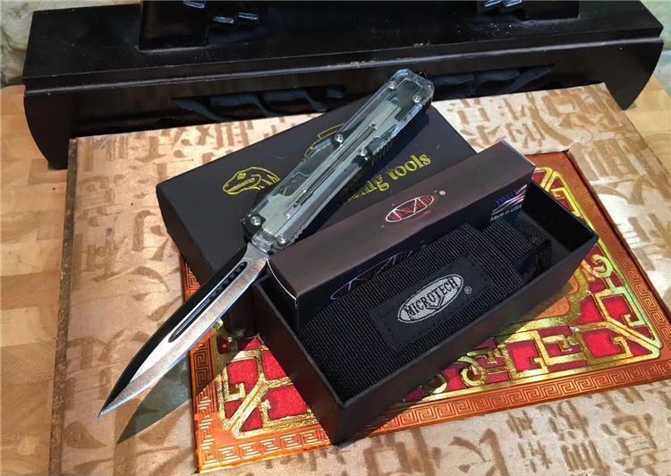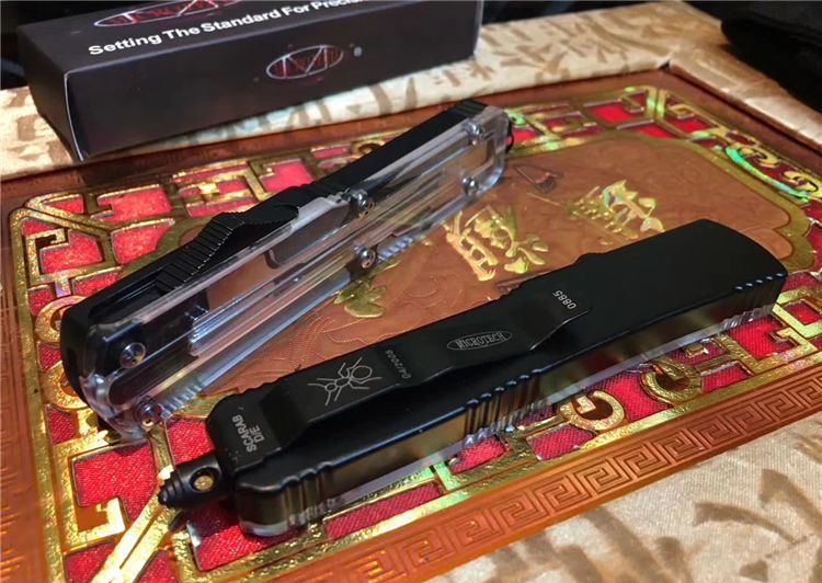 微技术圣甲虫直跳刀透视款 全长:21.3cm(含尾锥长度) 刃长:8.5cm 刃厚:3.2mm 刃材:440 硬度:57HRC 重量:185g 表面:缎光 柄:合金 刀鞘:尼龙